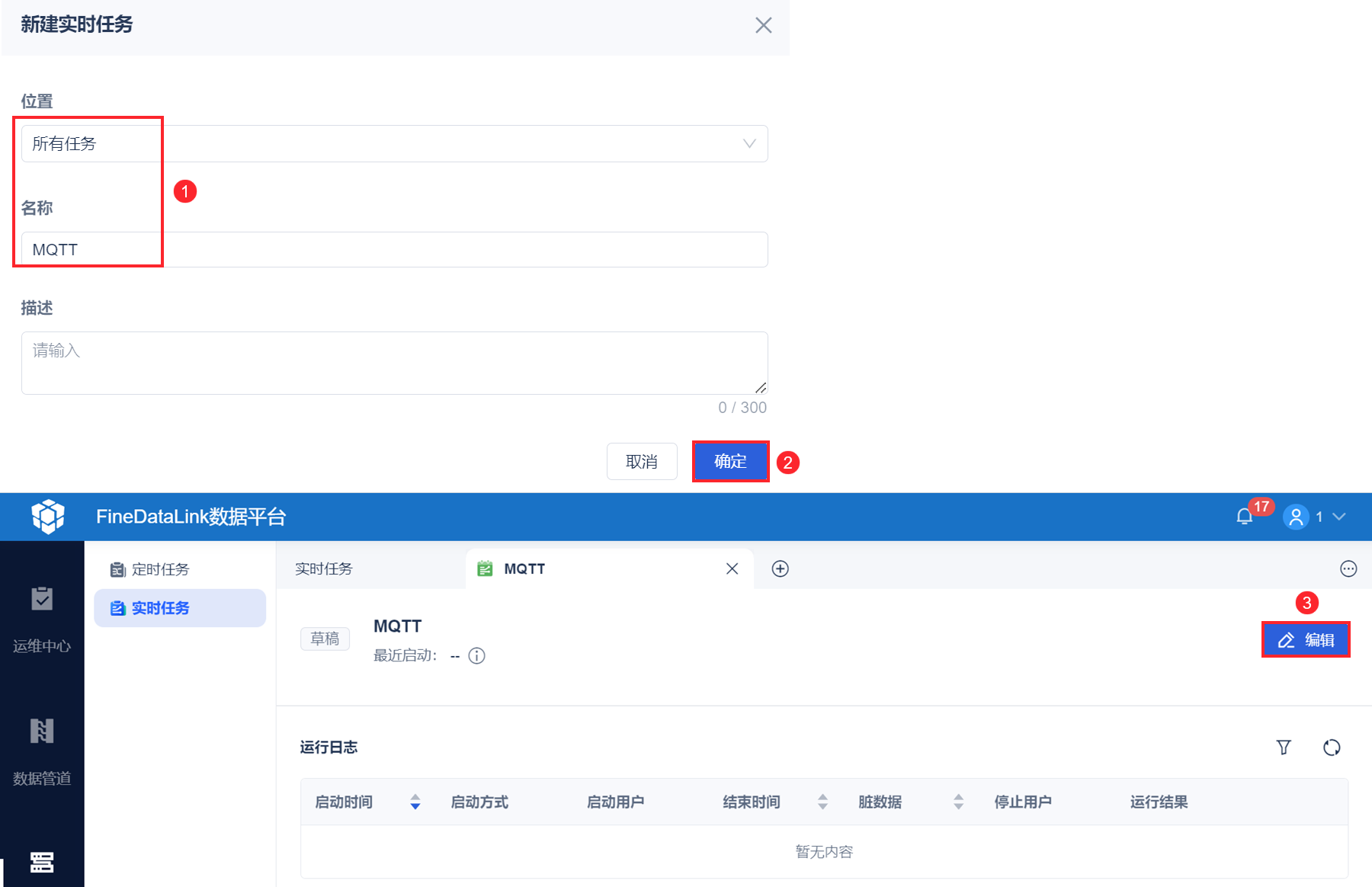 自定义位置和名称后,点击编辑按钮进入实时任务设计页面。如下图所示: