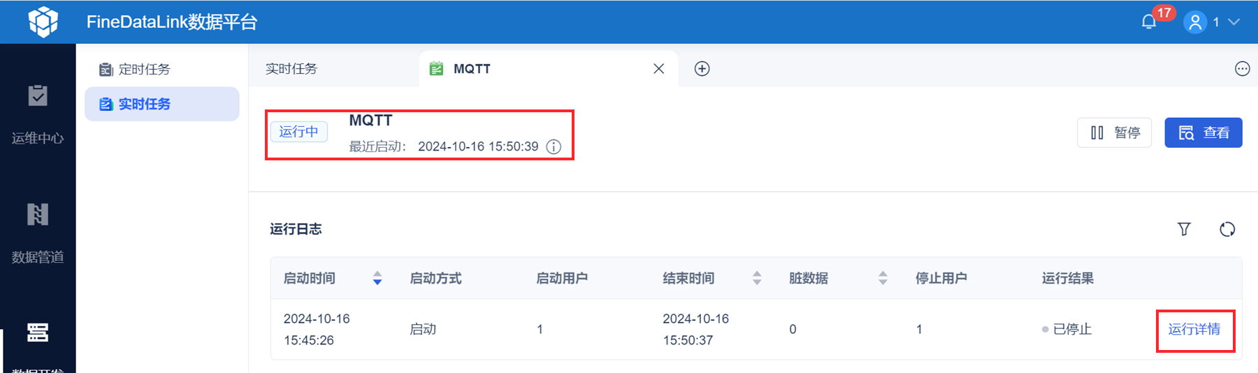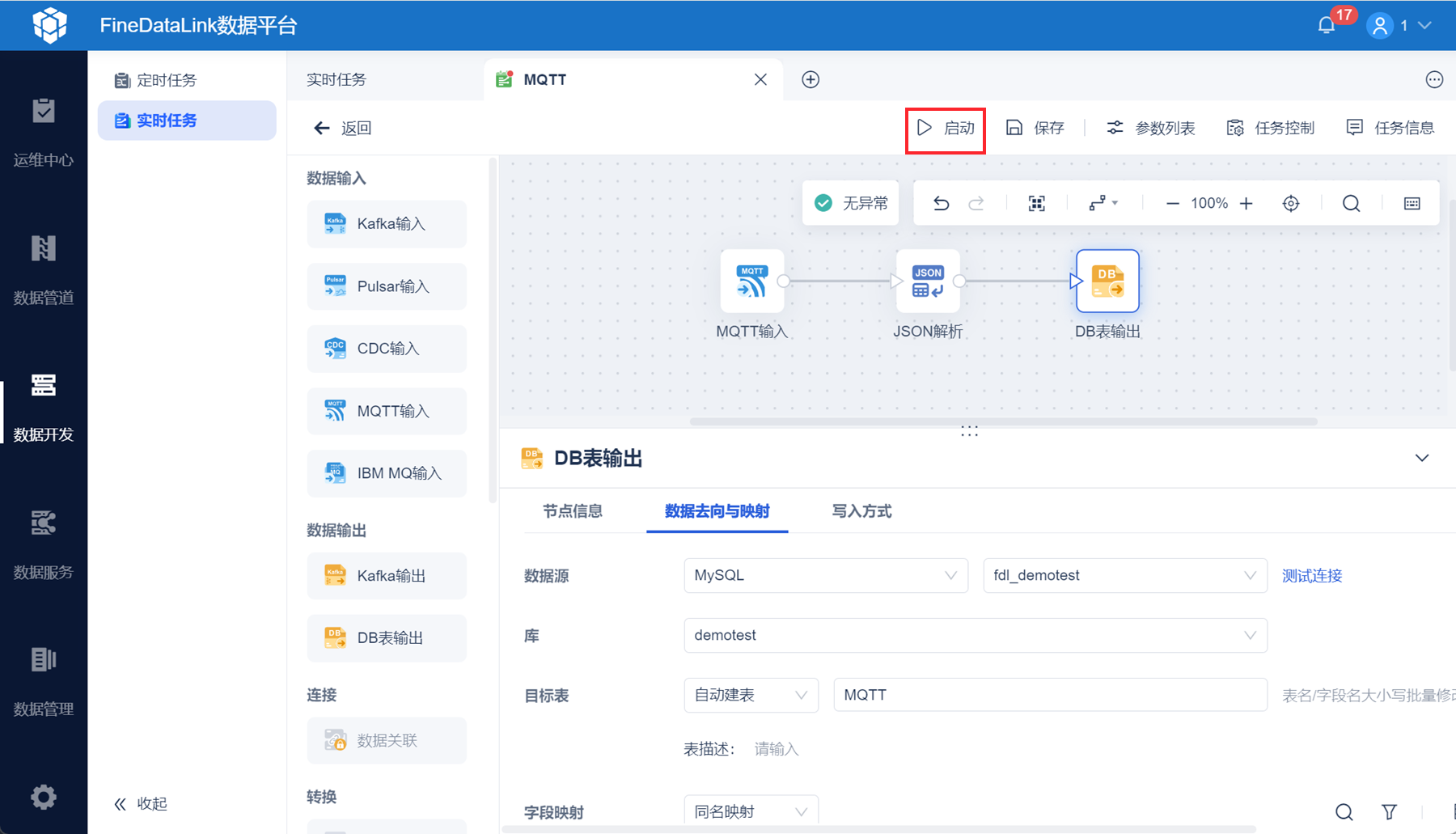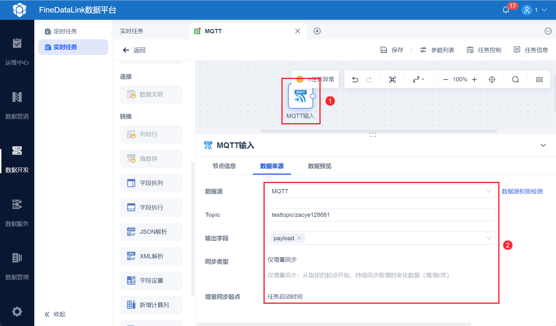 FineDataLink 的数据开发-实时任务支持使用「MQTT输入算子实时读取数据。