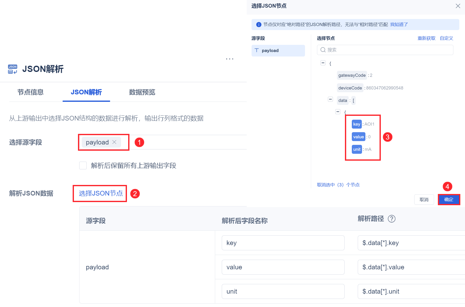 1)拖入JSON解析算子,解析 3.1 节取出的数据。如下图所示: