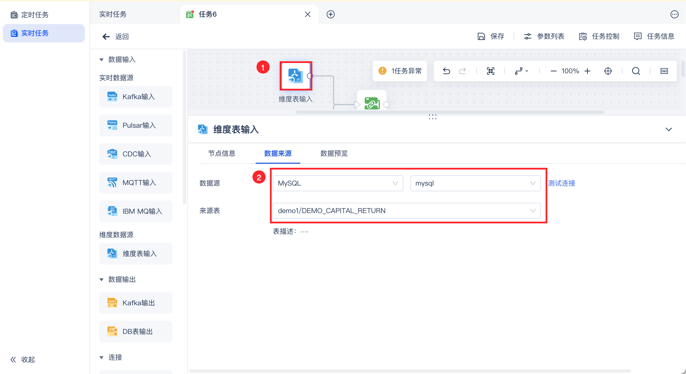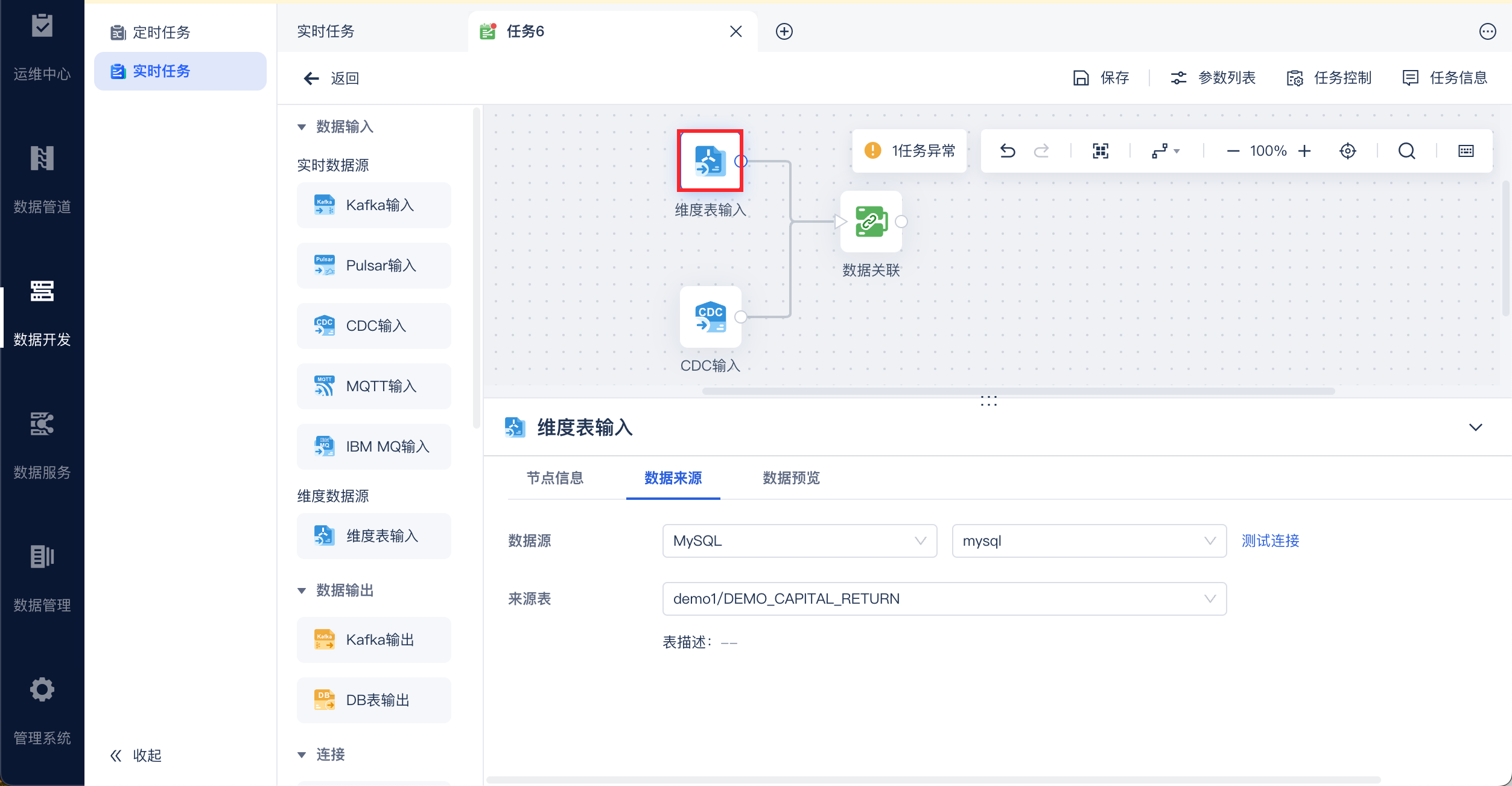维度表输入不可以作为独立的输入算子进行输出,维度表输入后必须接数据关联算子且关联算子必须包含一个实时数据源