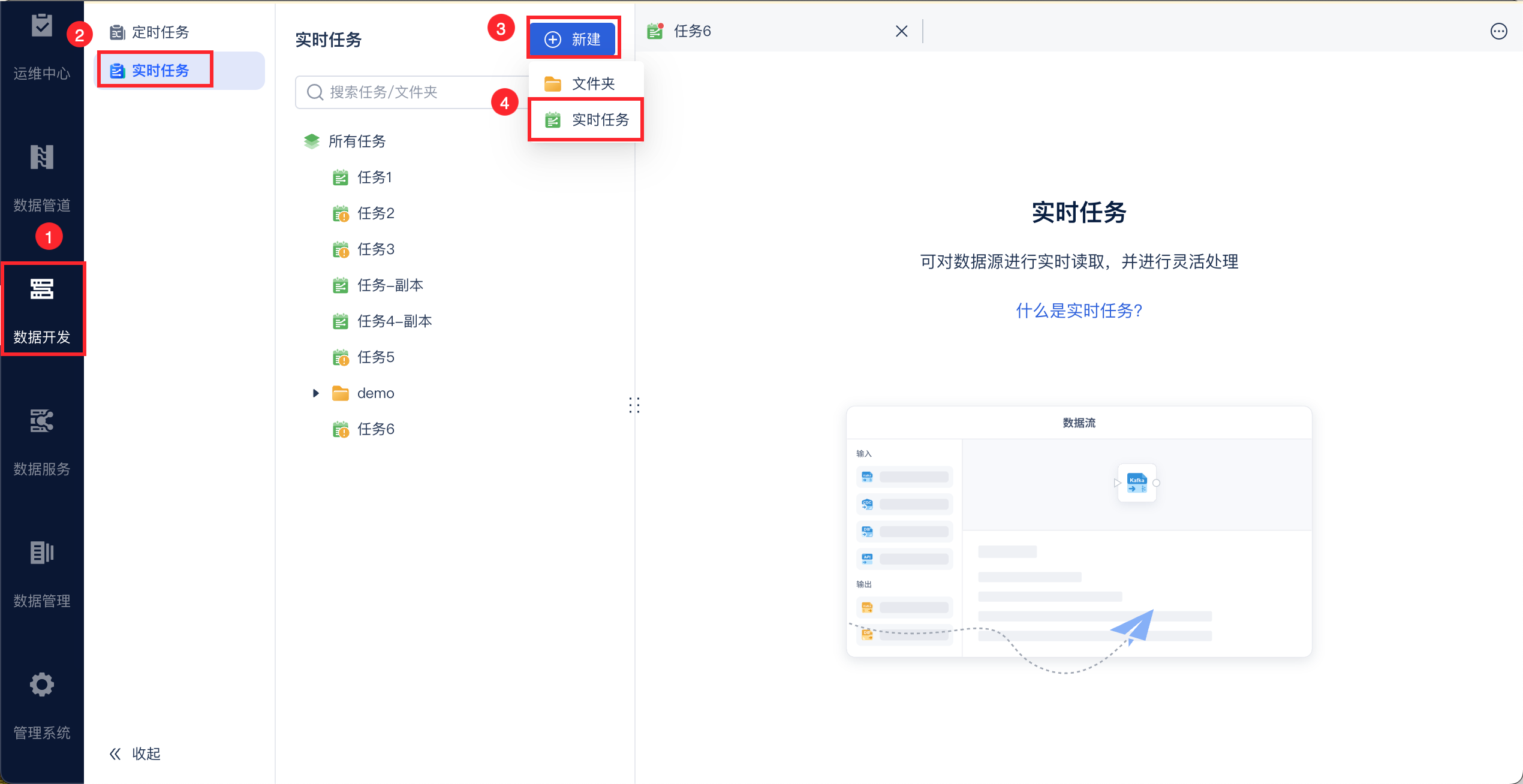 进入 FineDataLink 数据平台后,选择「数据开发>实时任务」,新建实时任务,如下图所示: