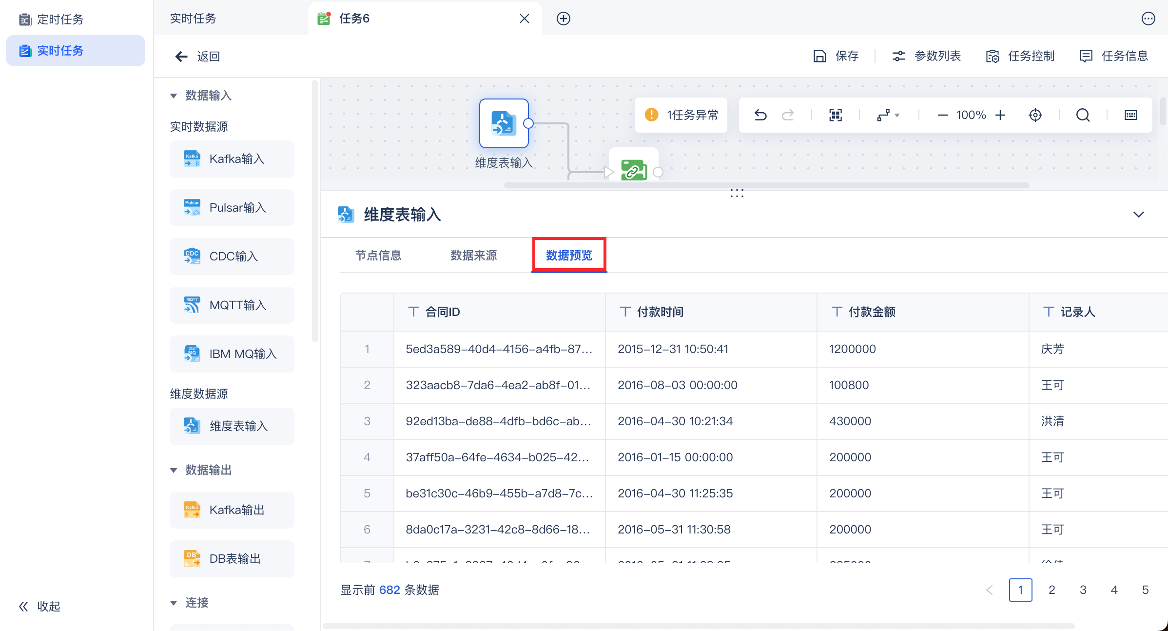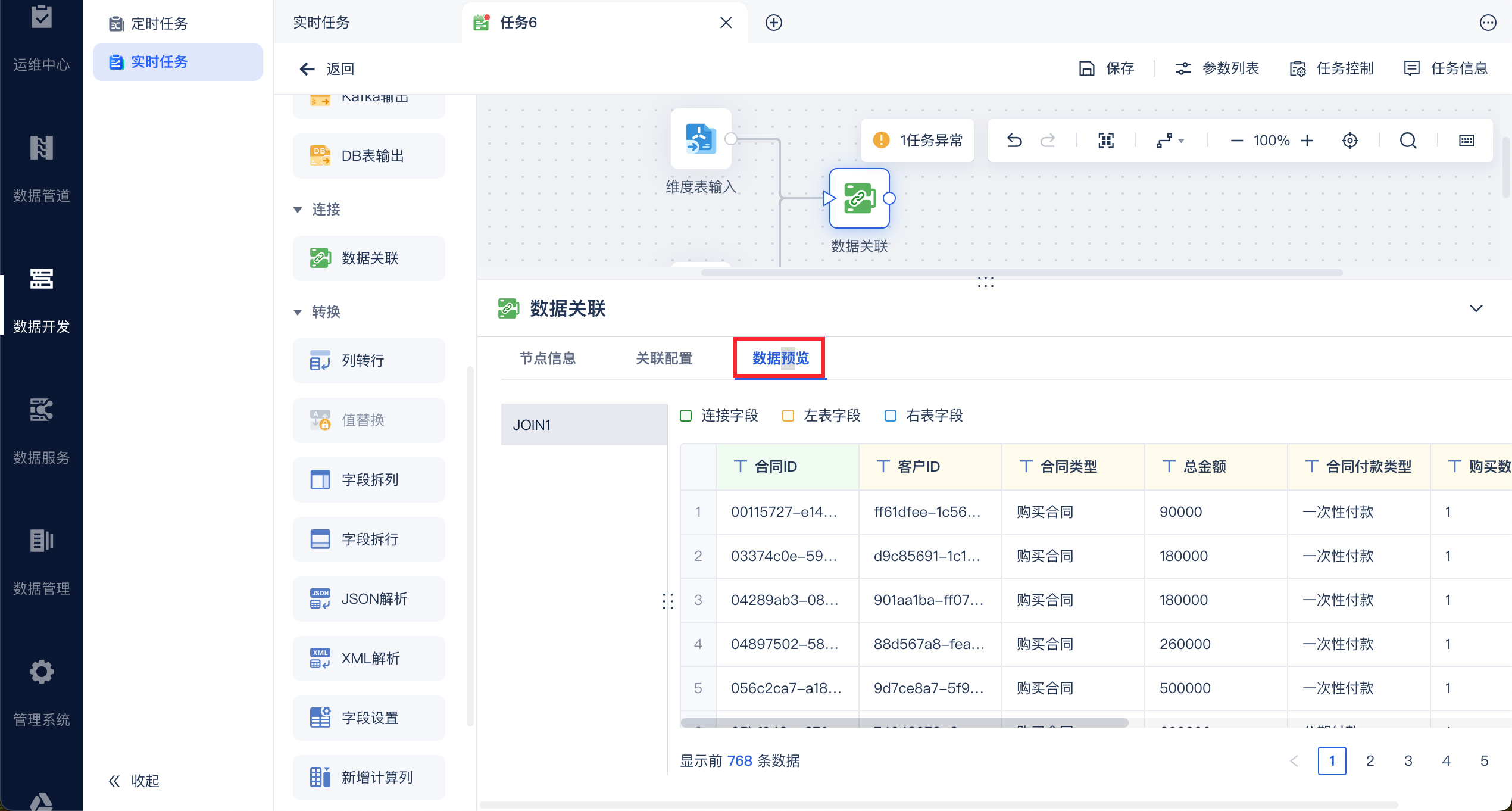 • 如果是实时数据源和维度表输入进行join,按照实时数据源的样本设置和算子配置进行数据预览