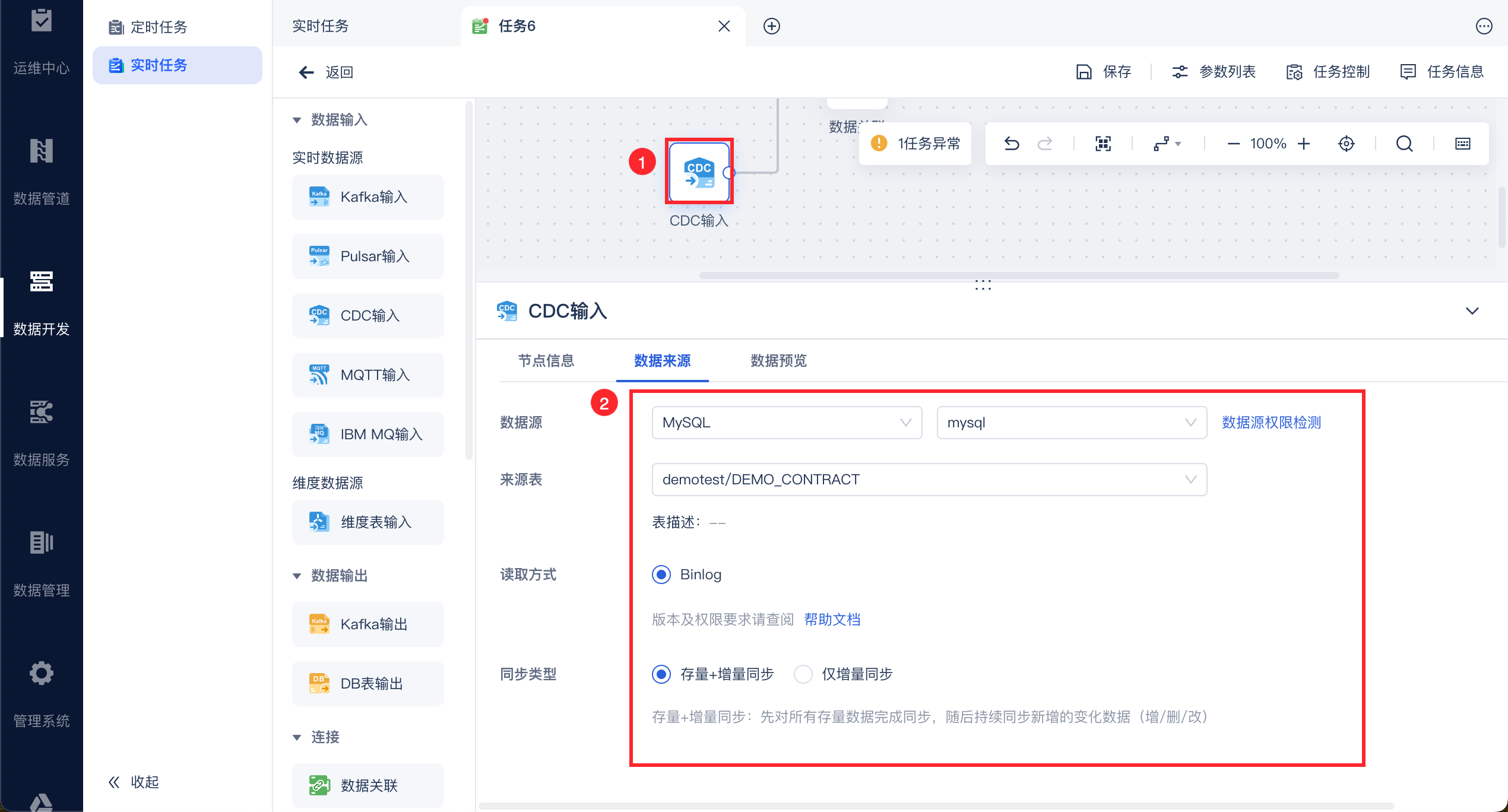 拖入实时数据源输入算子,比如 CDC 输入,选择数据源和数据表、读取方式、同步类型,如下图所示: