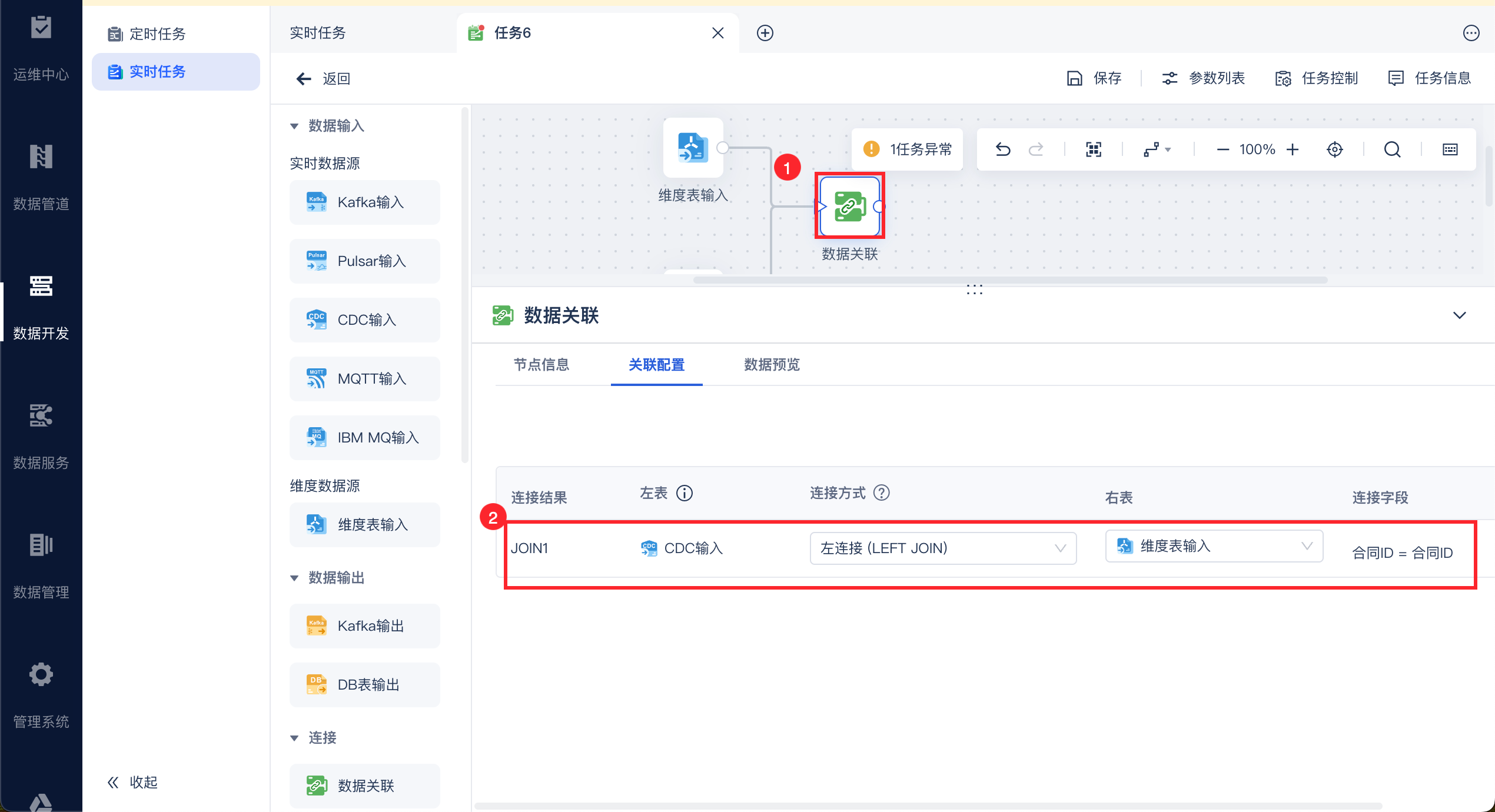 当实时数据源和维度表输入关联时,实时数据源必须是左表