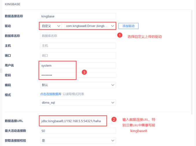 4)驱动切换为自定义,选择 2.2 节上传的驱动,然后输入 2.3 节收集的连接信息。如下图所示: