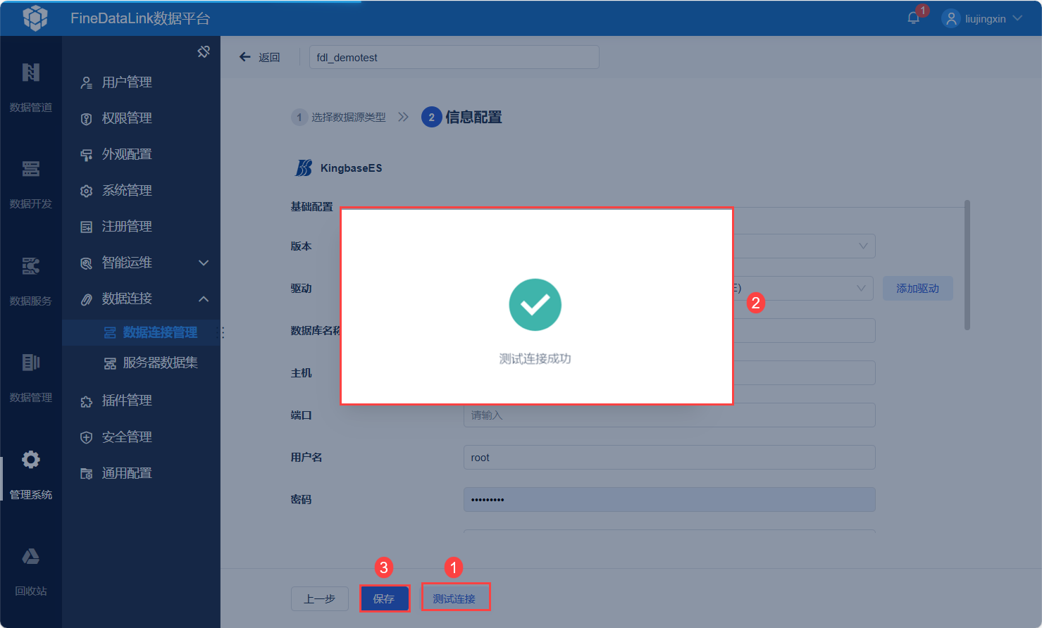 5)点击「测试连接」,若连接成功则「保存」该连接。如下图所示: