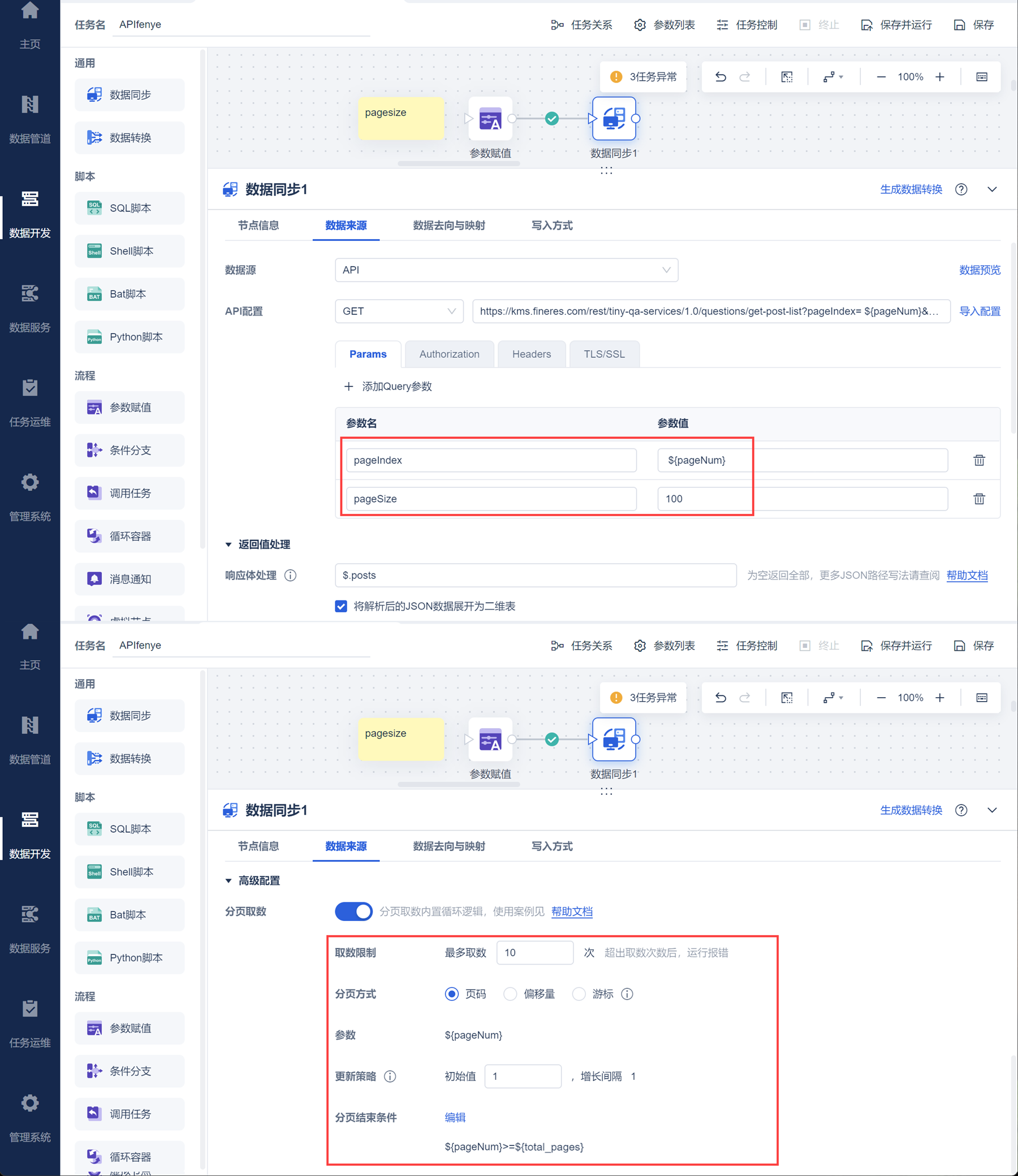 在数据同步中写入 API 配置,并设置参数名:pageSize,参数值:100,pageIndex 使用分页参数 ${pageNum} ,也就是按照每页 100 条数据,从第一页开始递增从接口取数,如下图所示: