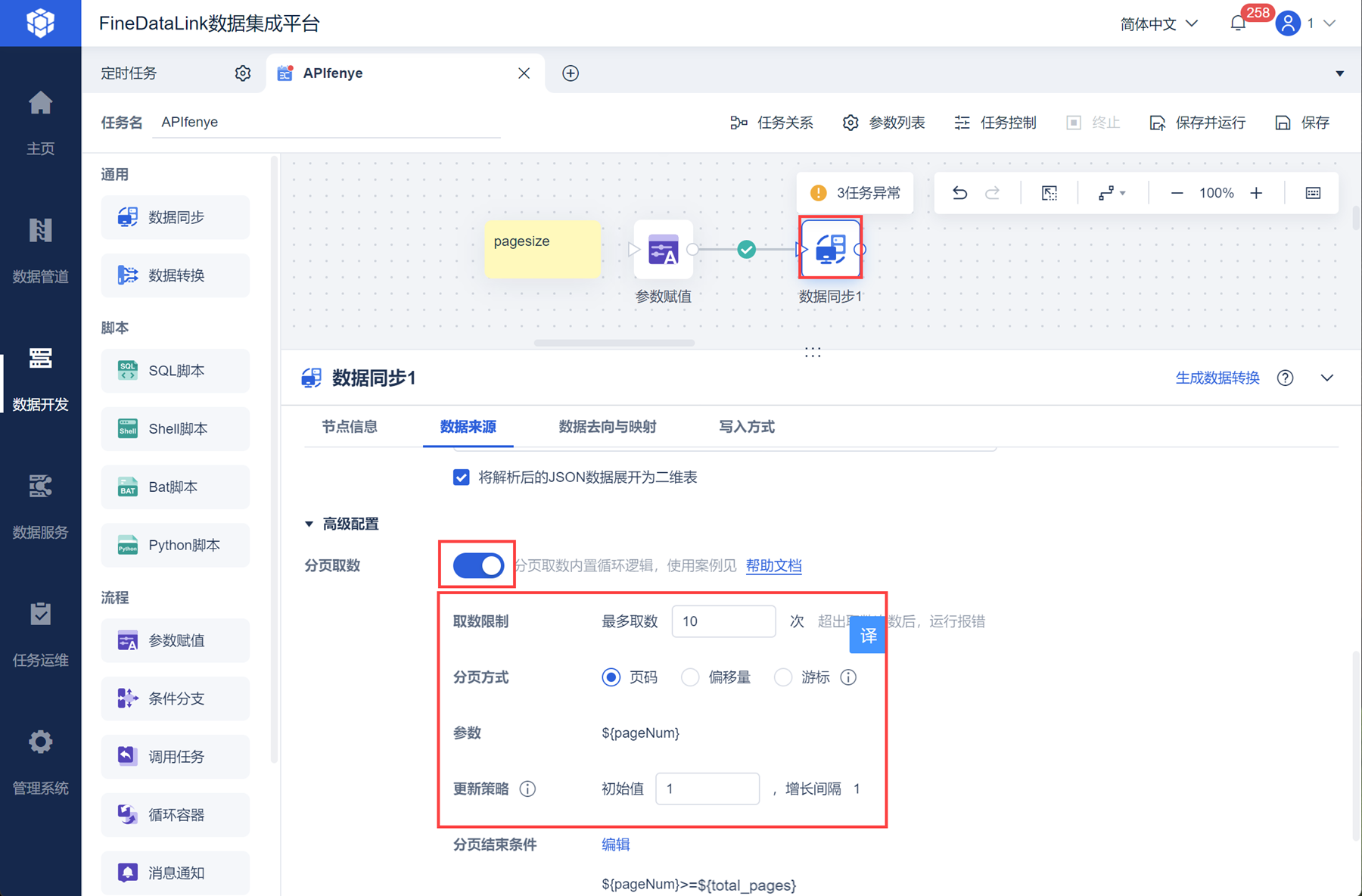 新增数据同步节点,选择 API 数据源后,勾选「分页取数」,设置取数逻辑,分页方式选择「页码」,更新策略为初始值 1 ,增长间隔 1,即按照设置的更新策略从第一页开始递增 ${pageNum}页数参数,从接口取数。该参数即可实现按照页数递增取出所有的数据。如下图所示: