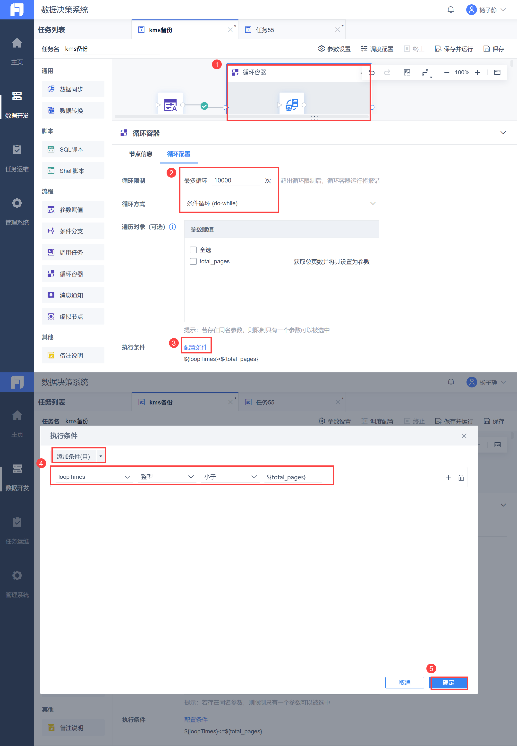 点击循环容器节点,设置循环次数,并设置循环方式为「条件循环」,点击配置条件为 loopTimes<${total_pages},如下图所示: