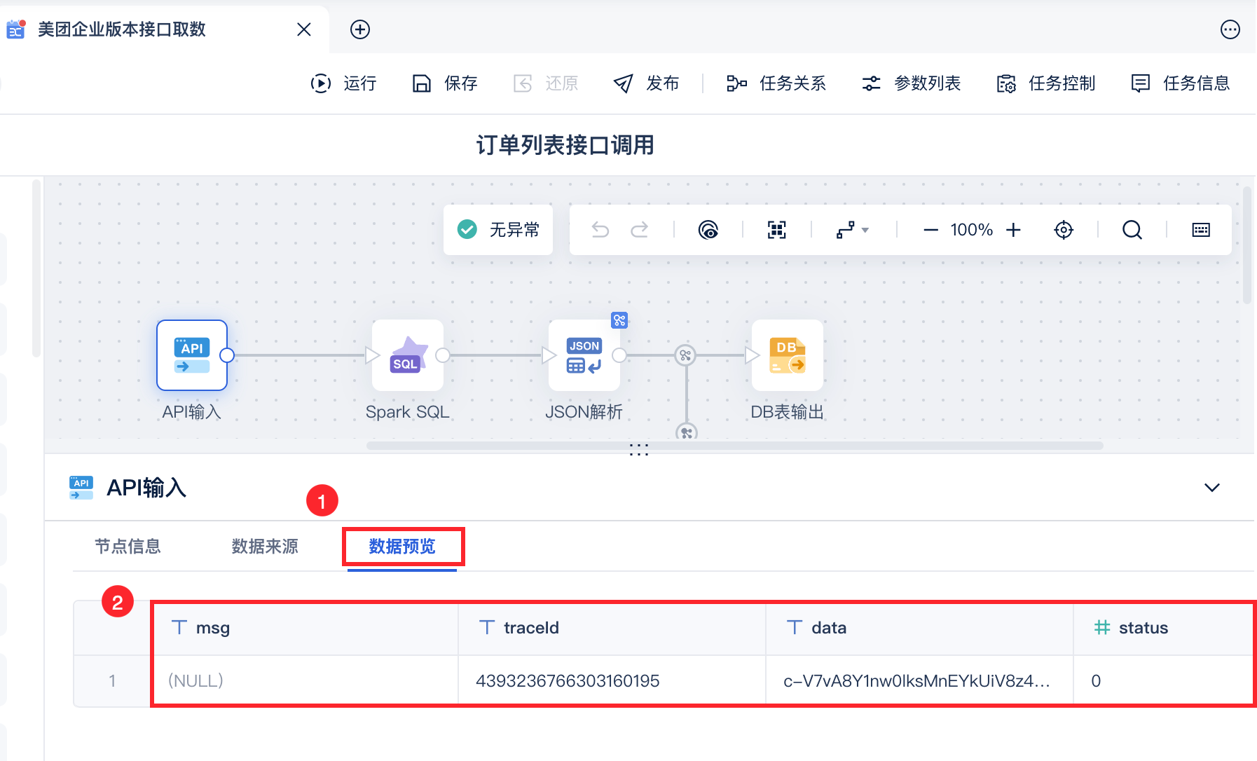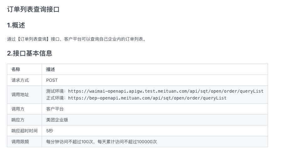 用户需要将美团企业版的接口数据取出,例如希望将 订单列表查询 中的数据取出,如下图所示: