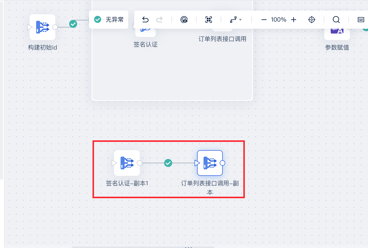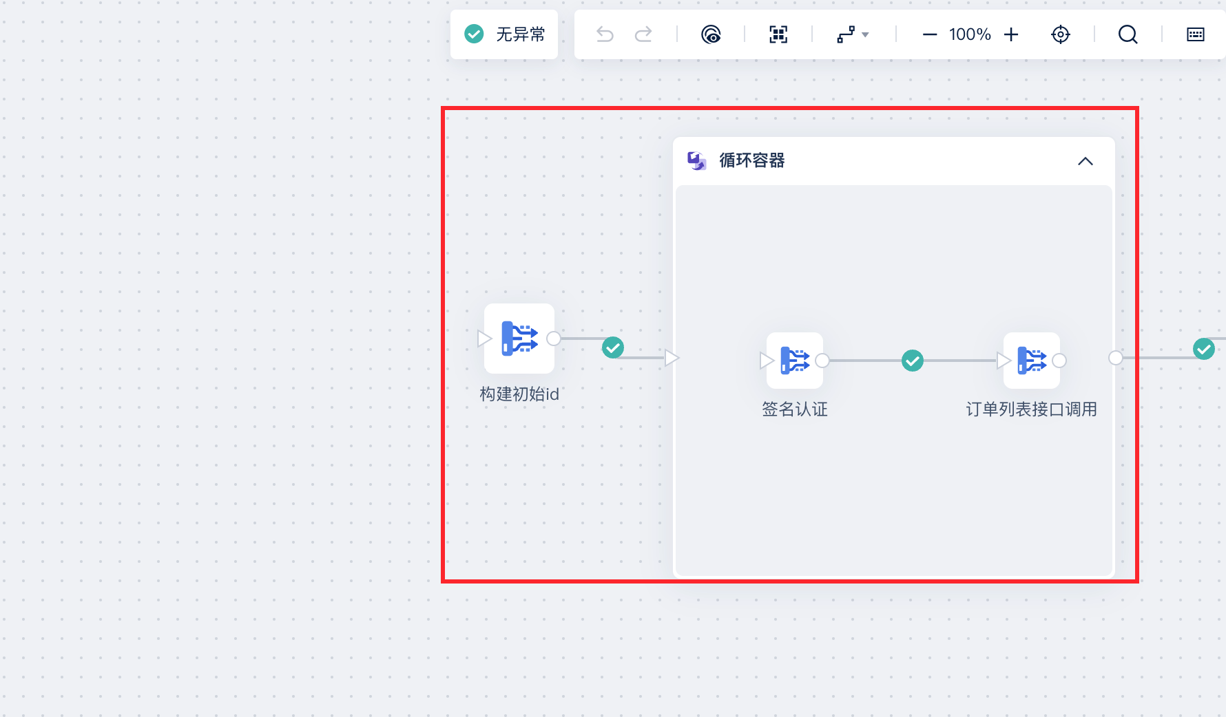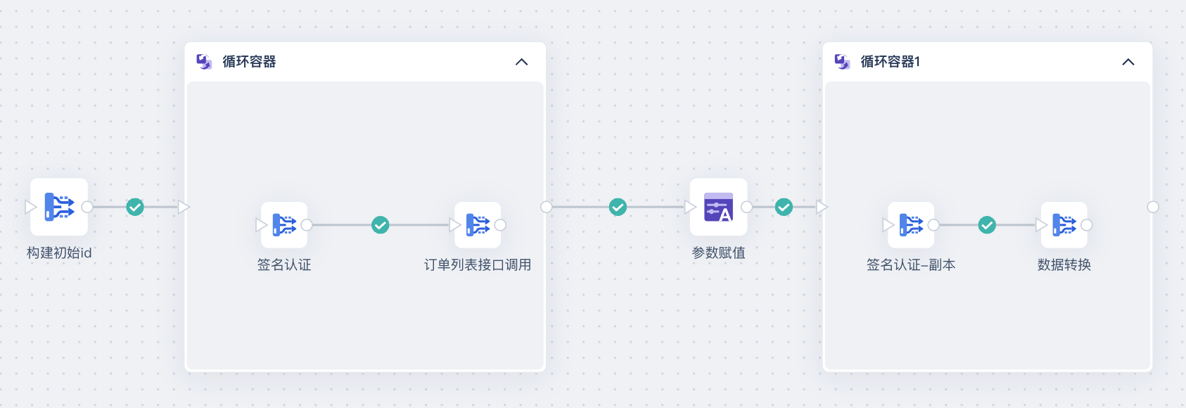 将 2.1 节和 2.2.1 节设置的数据转换节点拖入至循环容器,同时将 2.2.3 节的初始id 节点与循环容器相连,如下图所示: