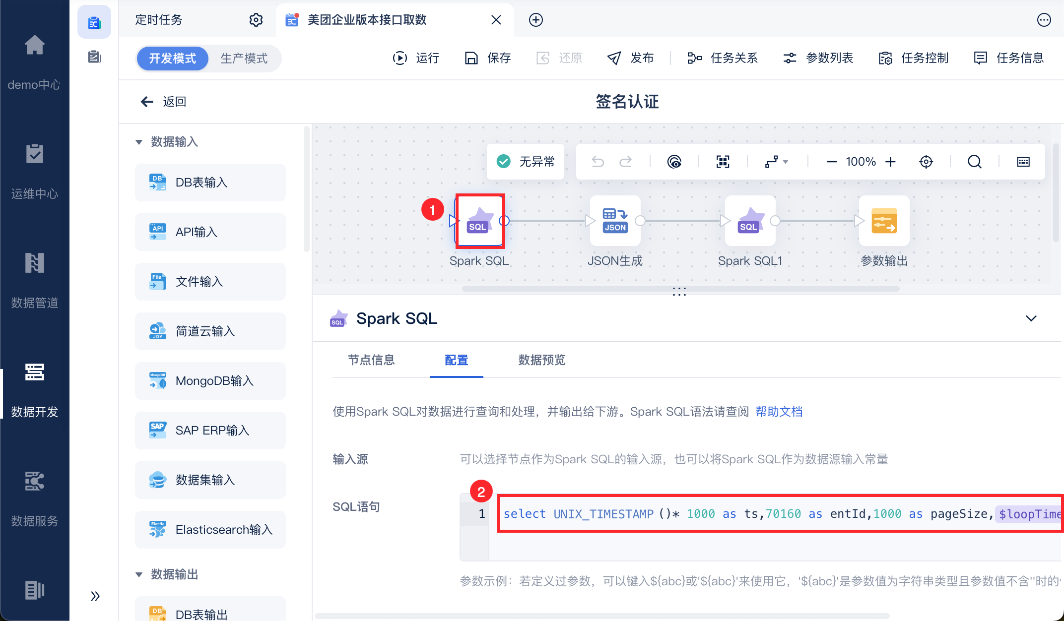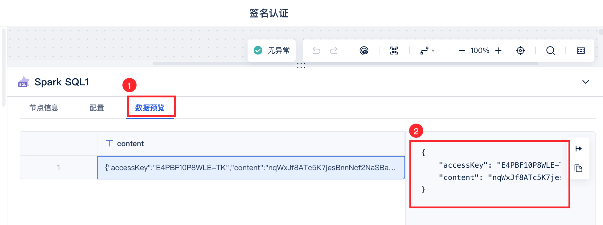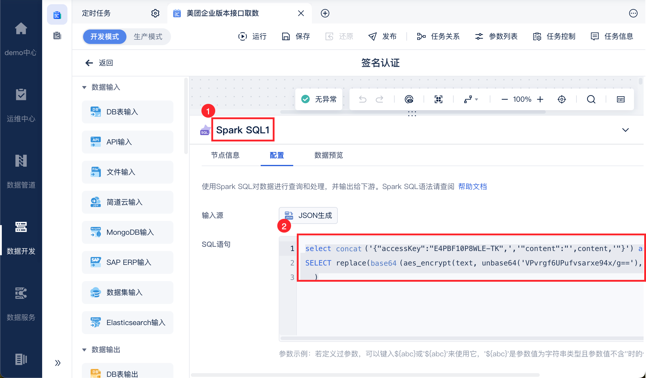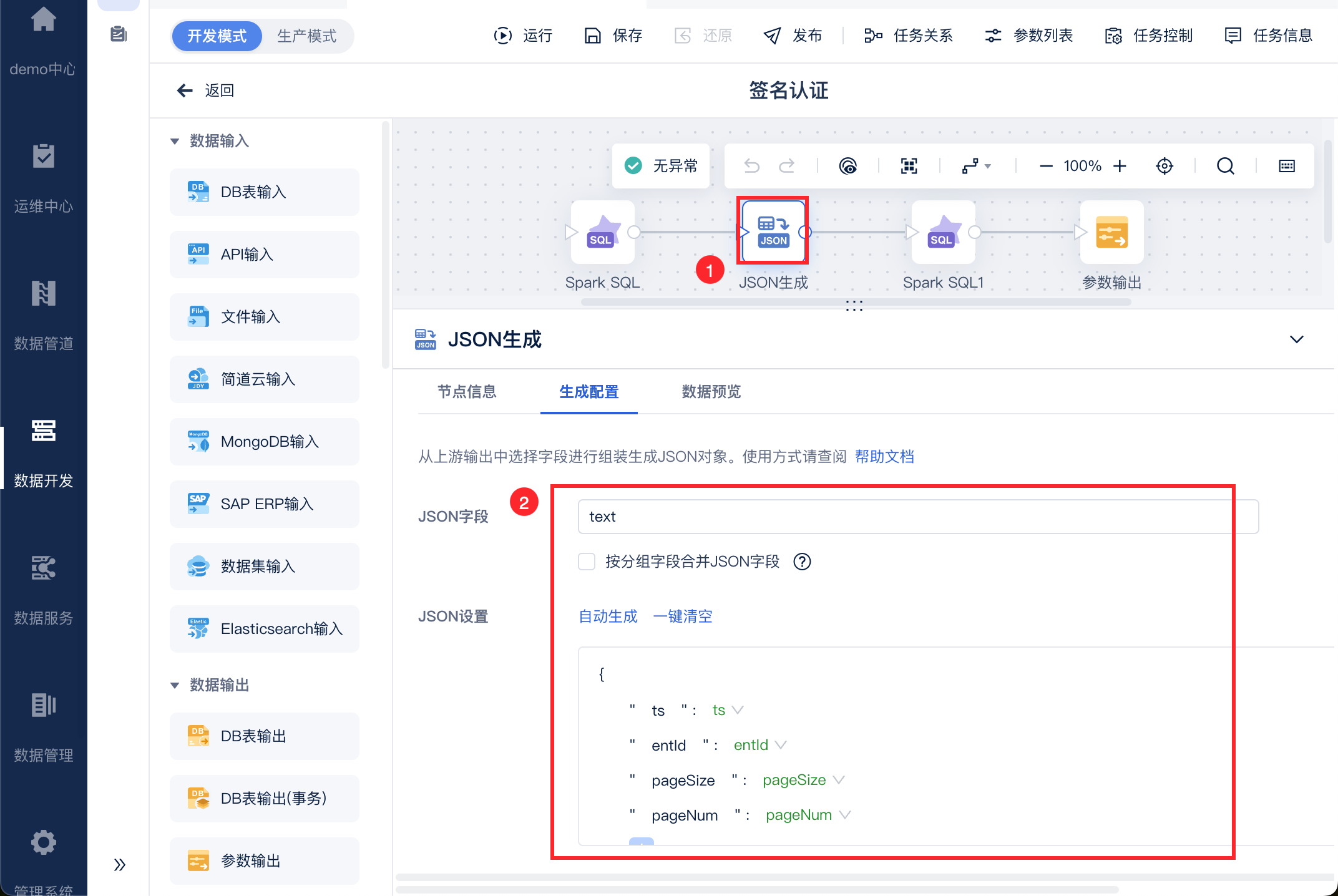 使用「数据转换」下的 SparkSQL 和 json 生成构建 content 明文。