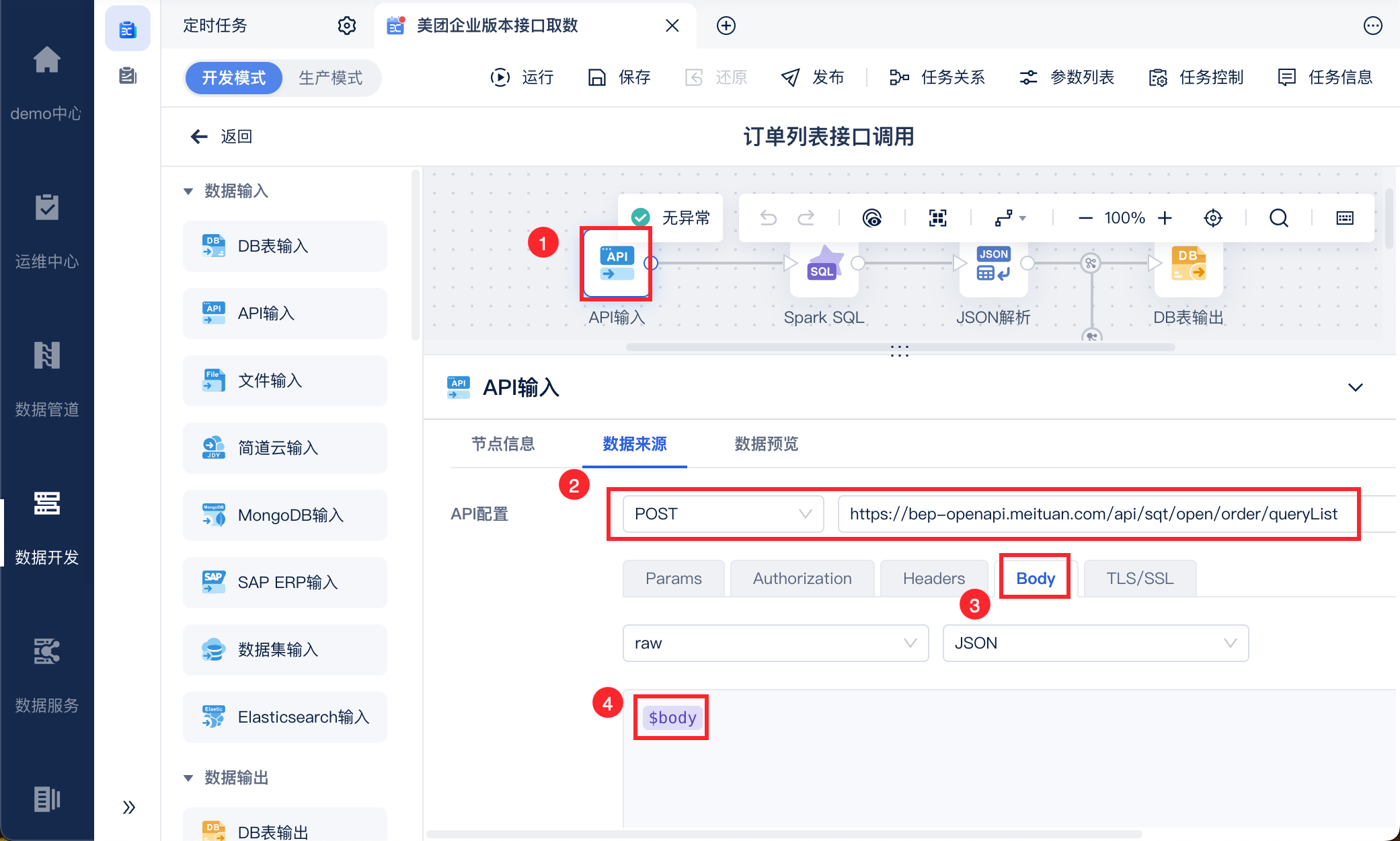 进入数据转换编辑界面,使用 API输入算子,选择请求方式,输入订单列表查询接口,并在 body 中输入 2.1 节输出的构建并输出的参数,如下图所示: