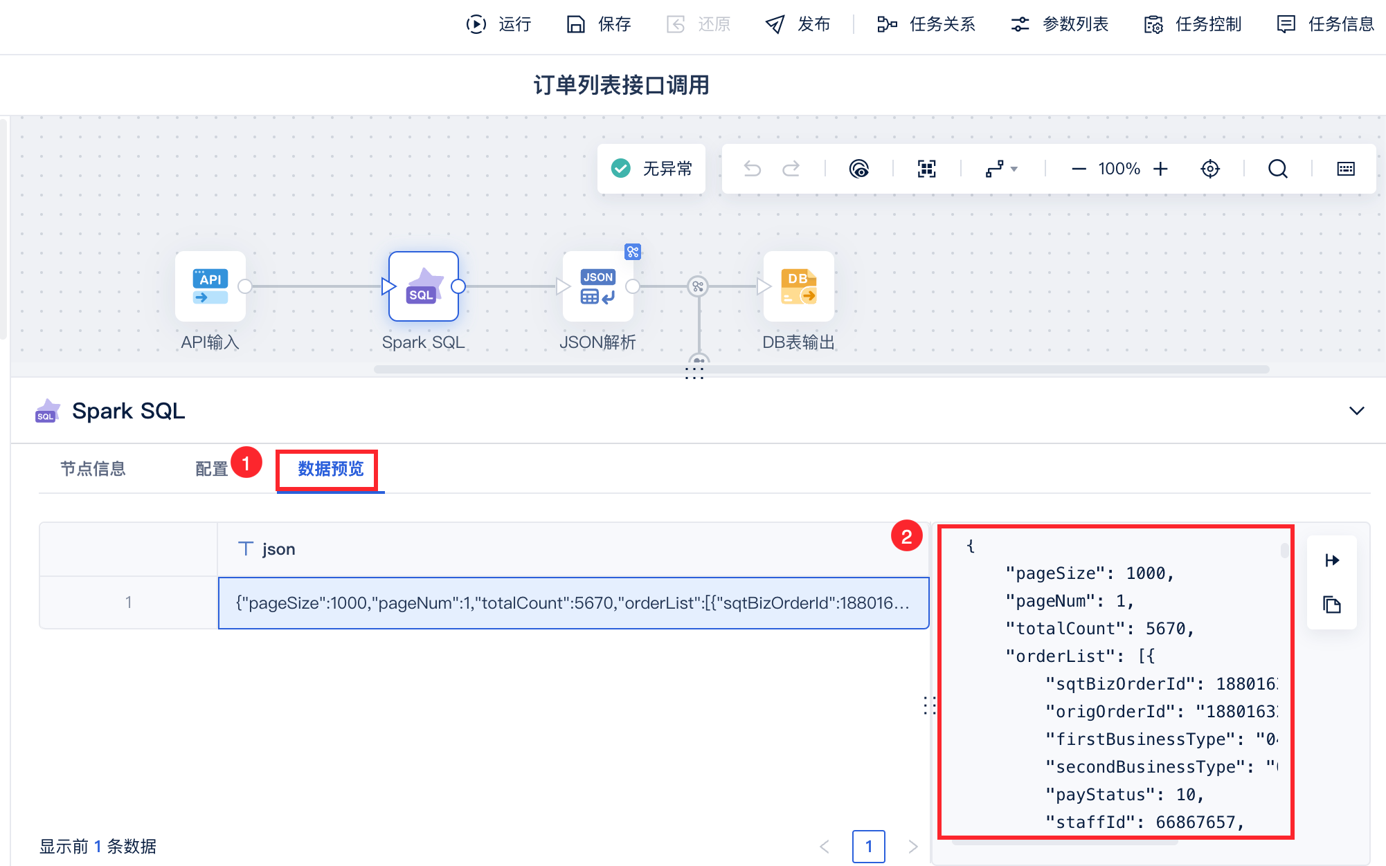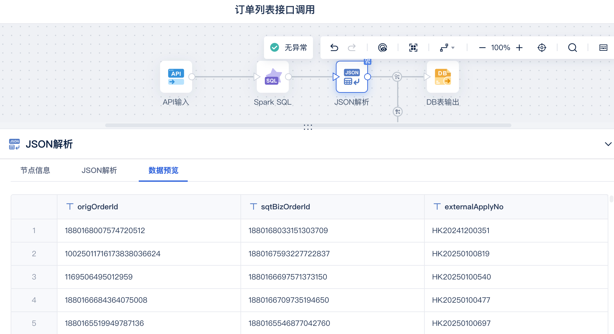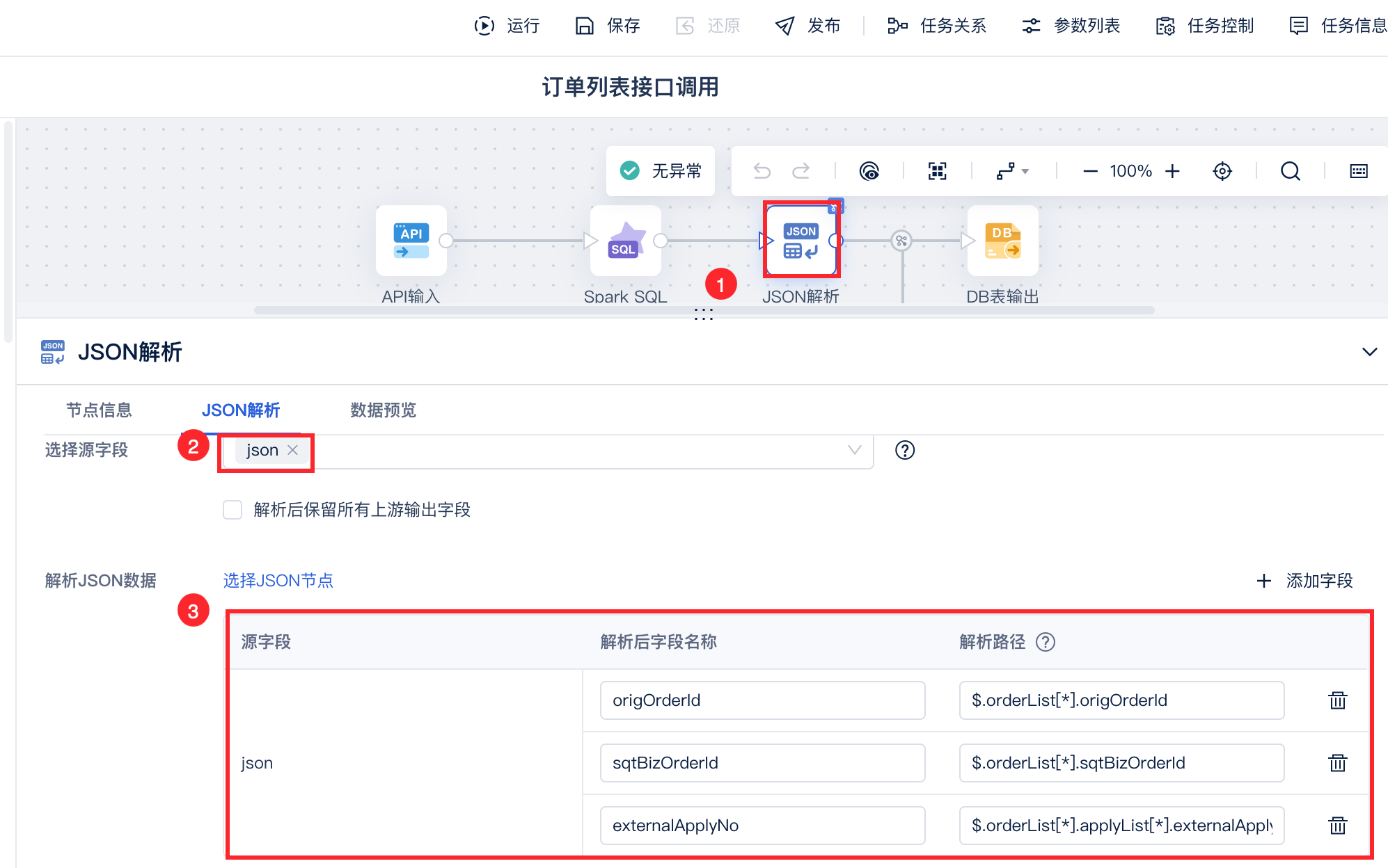 将解密后的订单列表数据使用 JSON解析算子解析出需要的字段,如下图所示:
