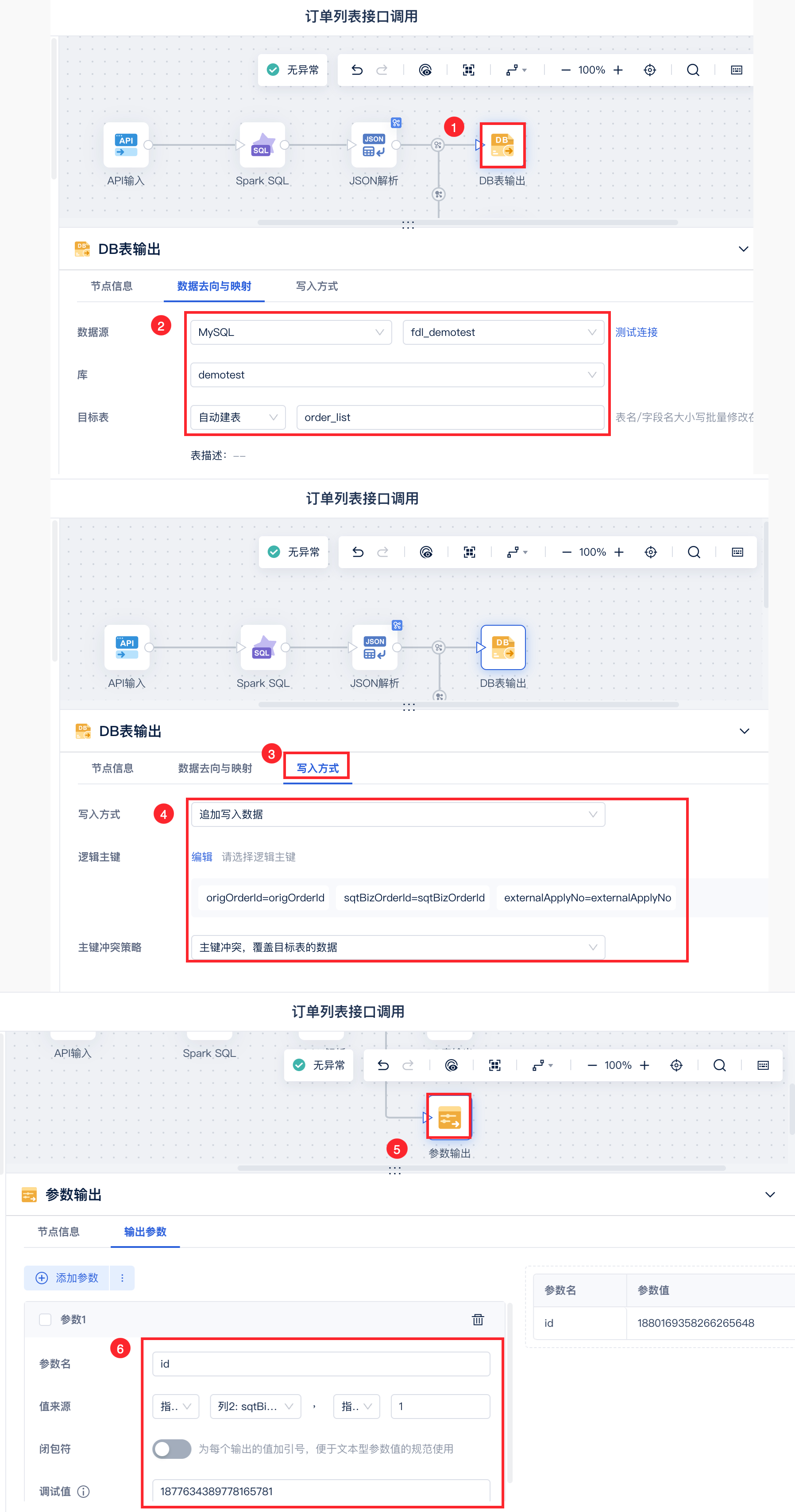同时将数据输出至数据库中,存储获取的 sqtBizOrderId 等,并将其设置为参数,以便使用循环容器,将其作为获取所有 id 数据的循环条件,如下图所示: