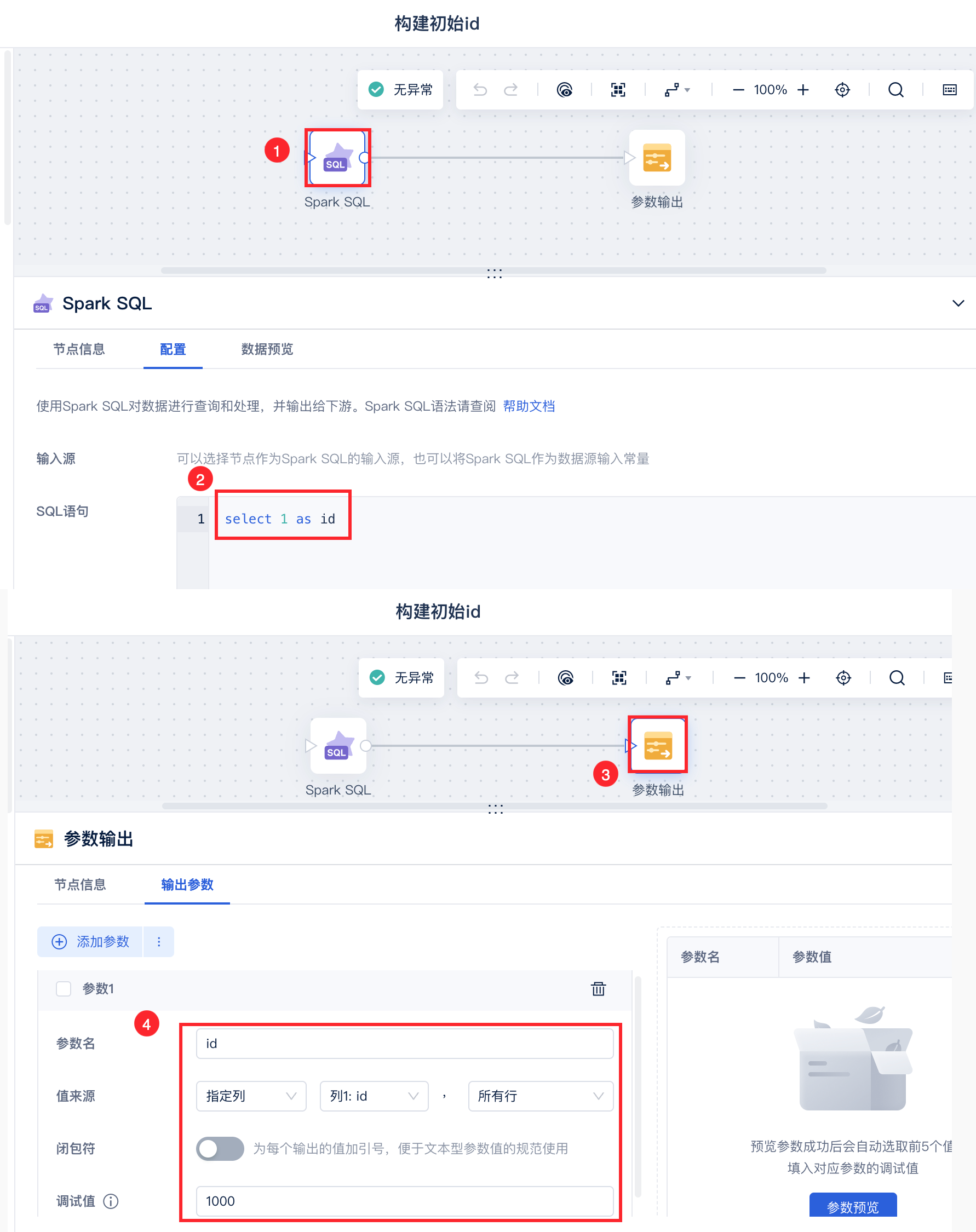 新建「数据转换」使用 SparkSQL 构建 id 参数,赋值1,让循环容器循环起来,如下图所示: