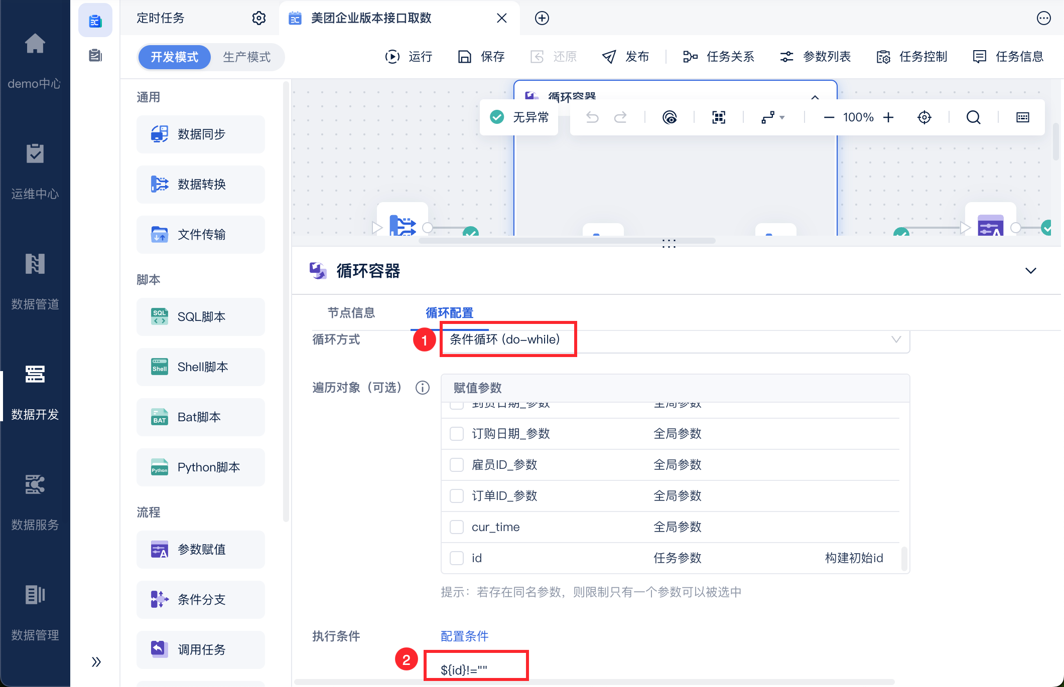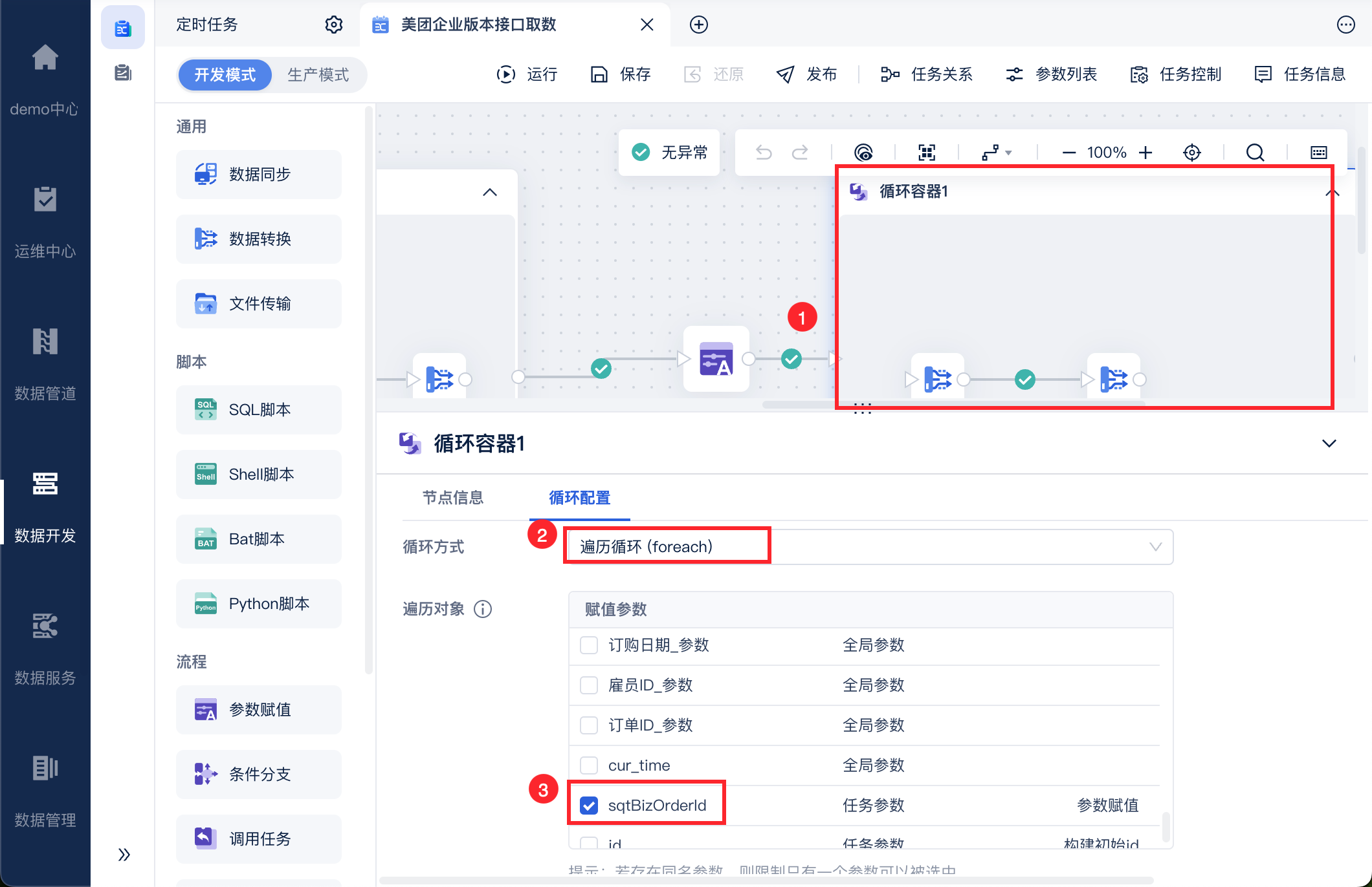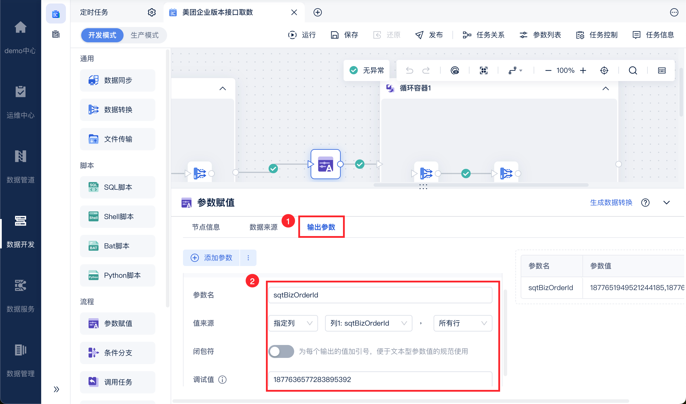 同时将数据输出至数据库中,存储获取的 sqtBizOrderId 等,并将其设置为参数,以便使用循环容器,将其作为获取所有 id 数据的循环条件,如下图所示: