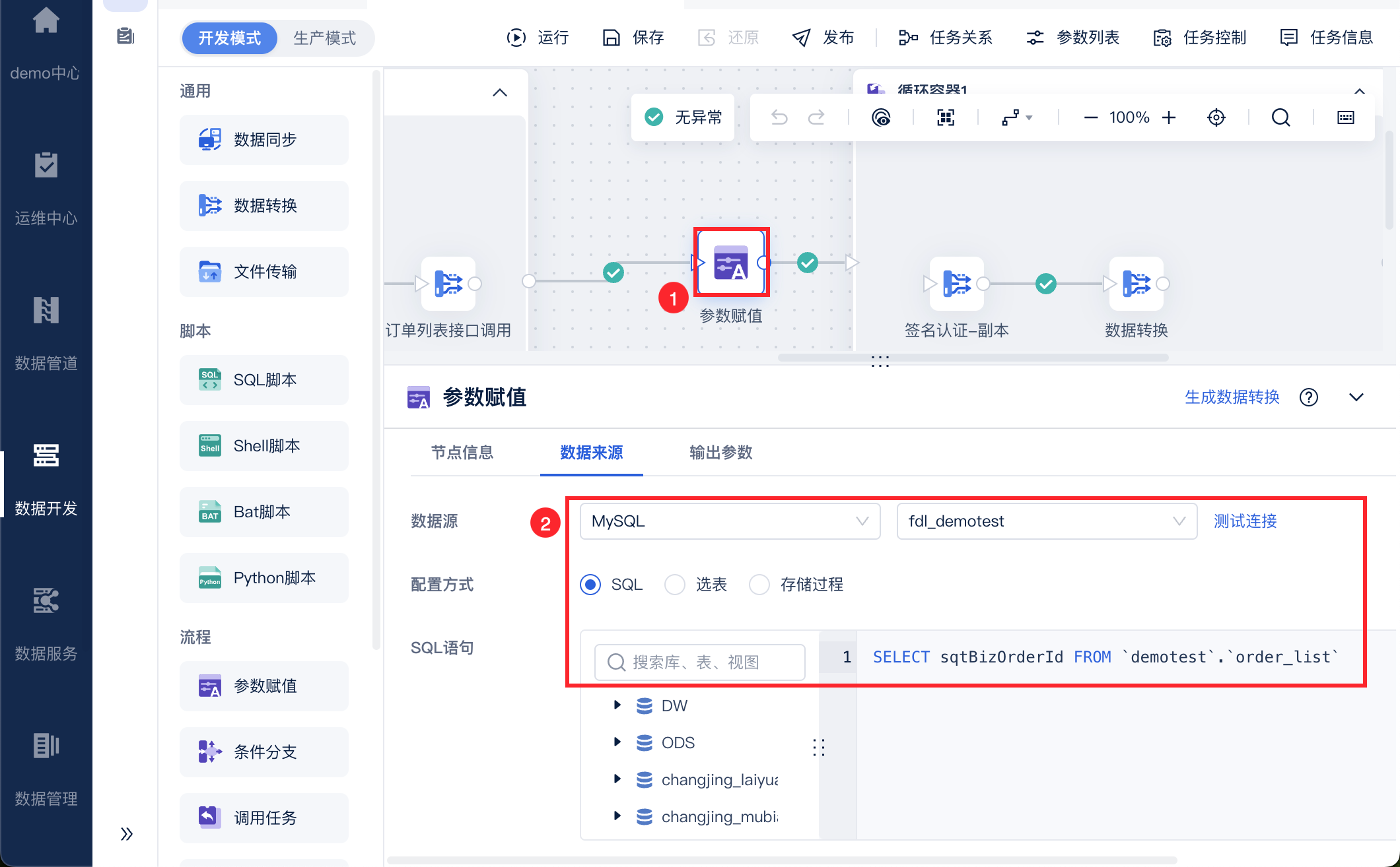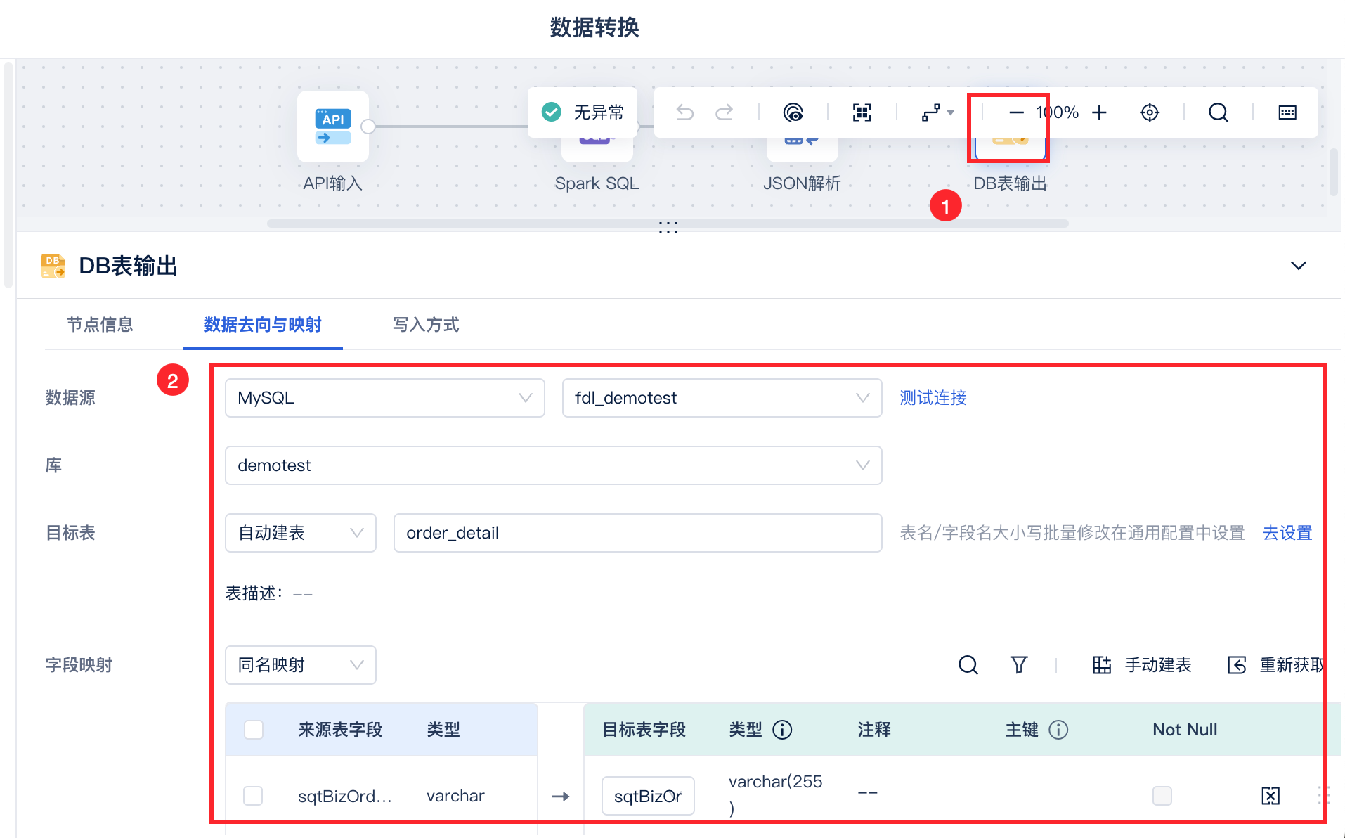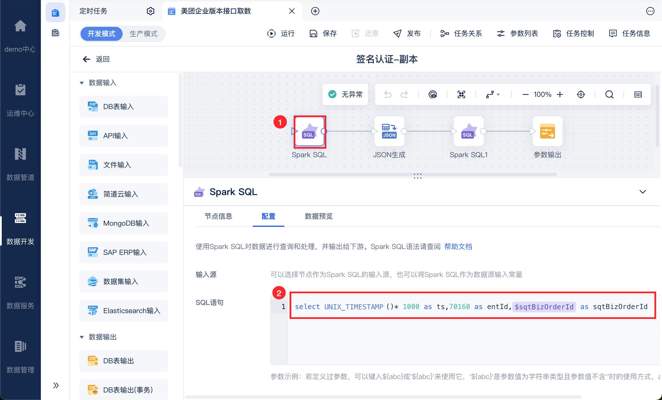 新建数据转换节点,再次构建签名认证,查看订单列表查询,需要使用 SparkSQL 构建 content 加密前数据结构,如下图所示: