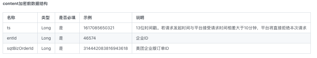 而「美团企业版」的所有接口调用需要对请求参数进行加密,响应参数进行解密,详情参见:签名实例