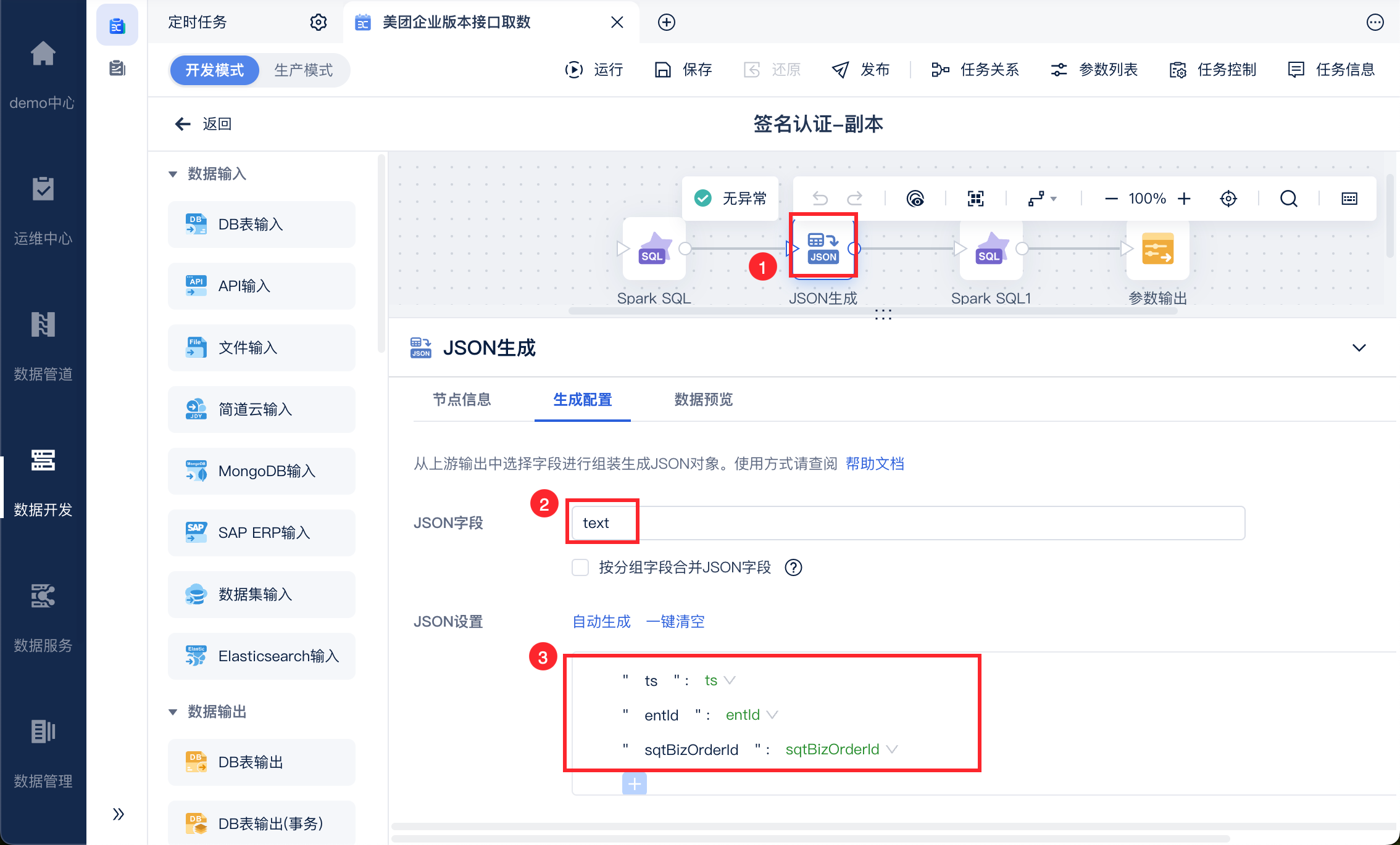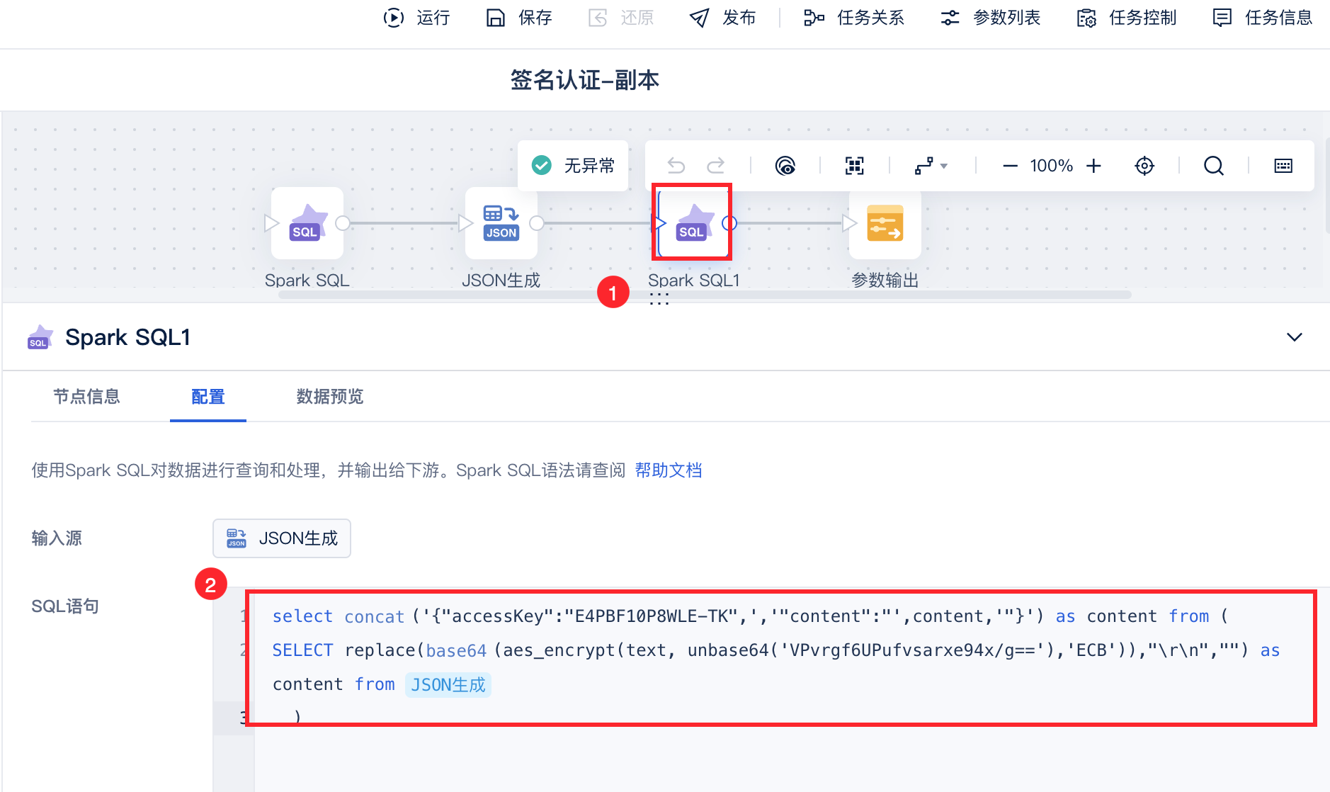 使用「数据转换」下的 SparkSQL 和 json 生成构建 content 明文。