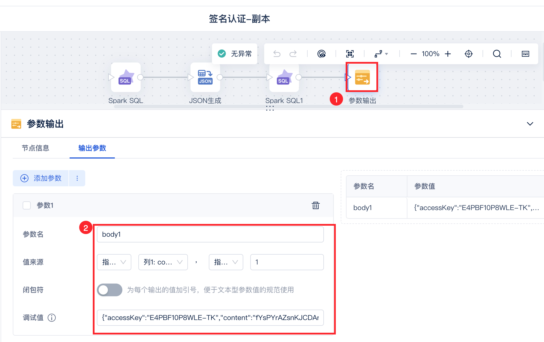加密获取 content 字段:使用 SparkSQL 进行加密,并构建请求的 body 参数,如下图所示: