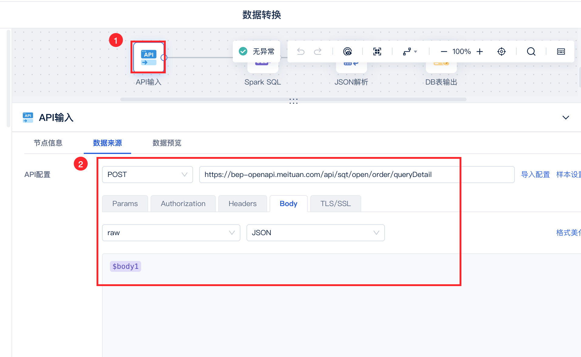 进入数据转换编辑界面,使用 API输入算子,选择请求方式,输入订单列表查询接口,并在 body 中输入 2.1 节输出的构建并输出的参数,如下图所示: