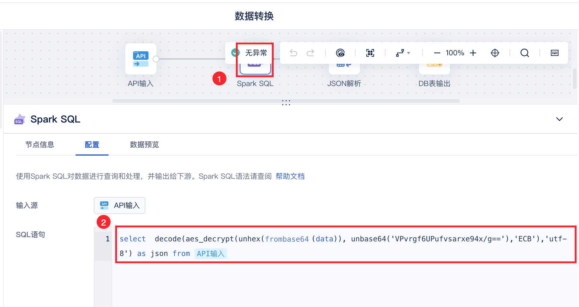 使用 SparkSQL 对 data 进行解密,输入如下 SQL,如下图所示: