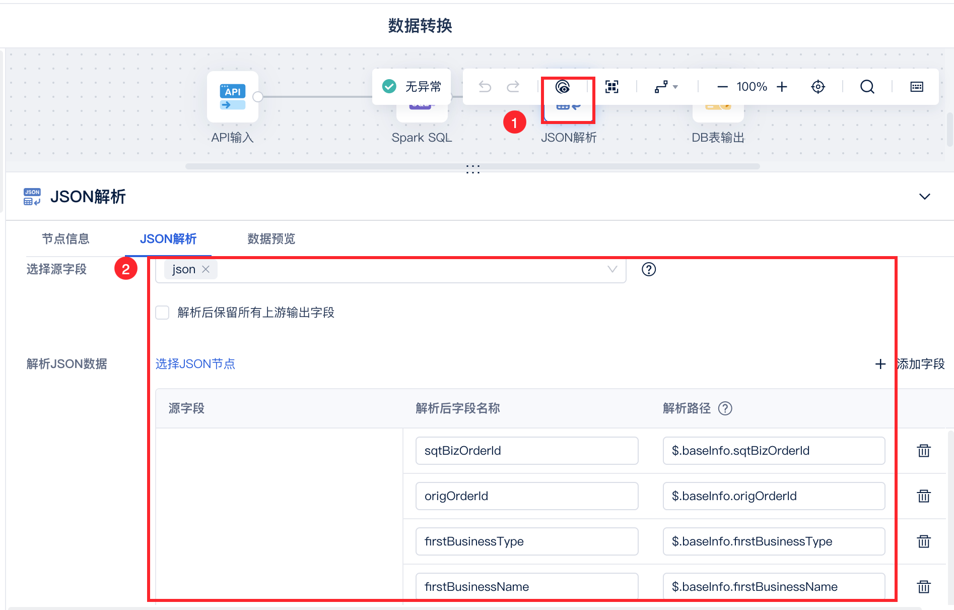 将解密后的订单列表数据使用 JSON解析算子解析出需要的字段,如下图所示: