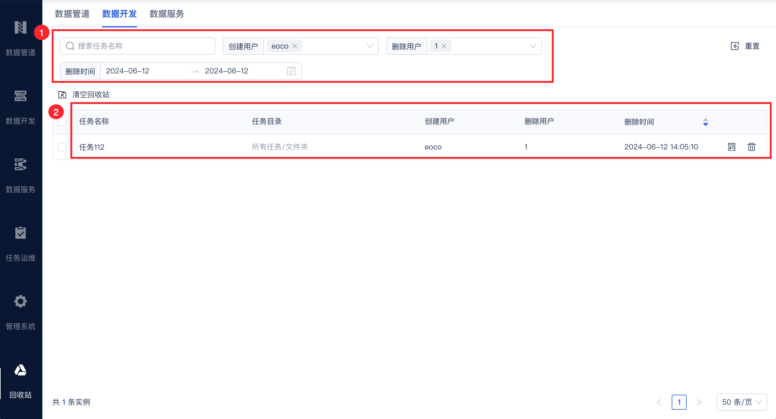 回收站支持对「数据开发」、「数据管道」、「数据服务」中已经删除的任务进行资源还原、彻底删除等。