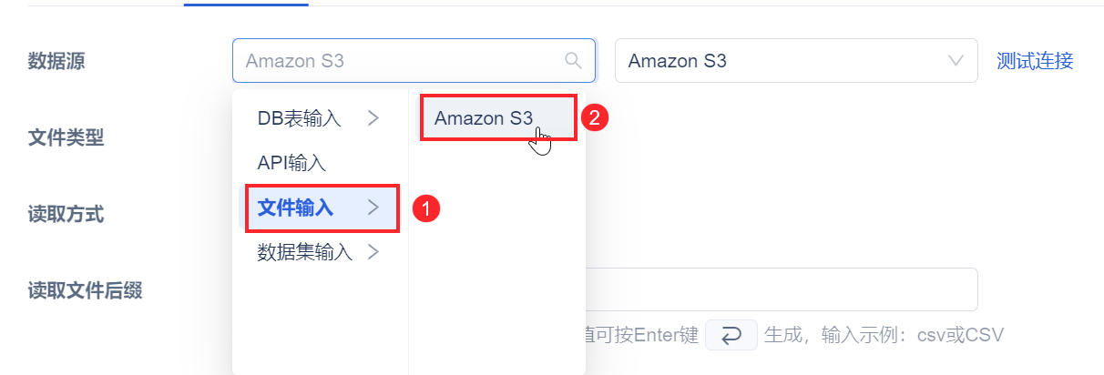 1)「全局赋值参数」、「数据同步」、「参数赋值」、「数据转换-文件输入」的数据来源新增:Amazon S3。如下图所示: