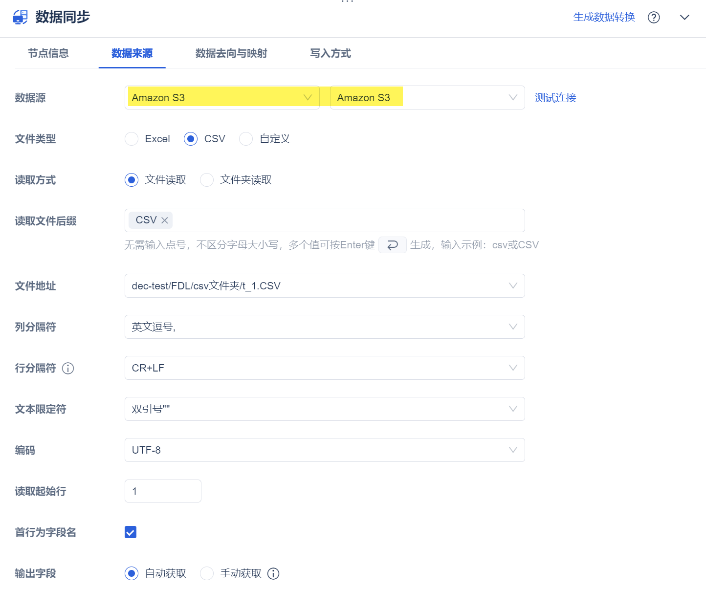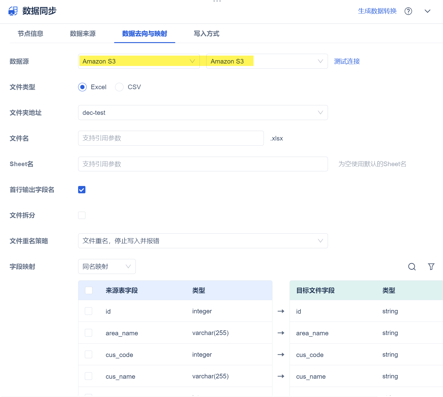 1)「数据同步」、「数据转换-文件输出」的数据去向新增:Amazon S3。如下图所示: