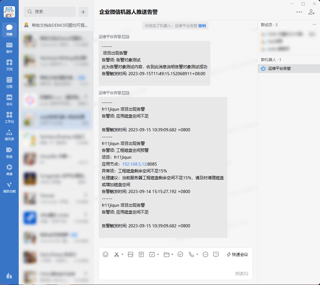 • 企业微信通知:企业微信是一种企业级即时通讯工具,支持文本、图片、语音和文件等多种消息类型。通过将告警通知集成到企业微信中,管理员可以及时接收告警信息,并可以通过与团队成员进行实时沟通来协作解决问题。这种方式特别适用于团队合作和跨部门协作的场景。