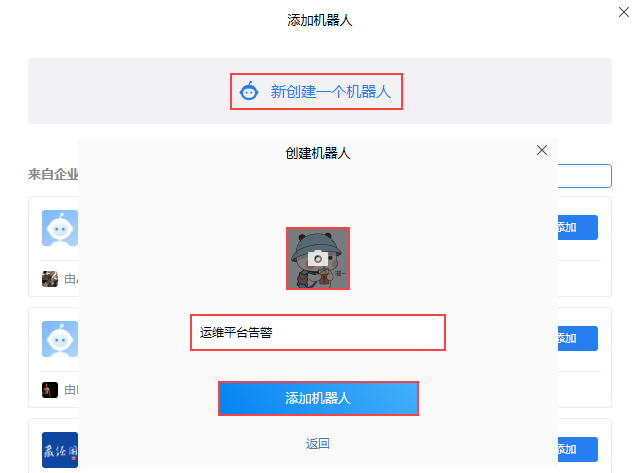 2)点击「新创建一个机器人」,设置机器人头像和名称,点击「添加机器人」,即可将机器人添加到企业微信群中。