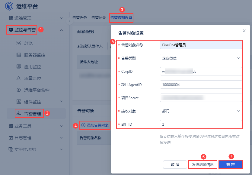 接收对象用于接收告警的部门或用户ID,请确保该部门/用户在上文设置的应用可见范围内
