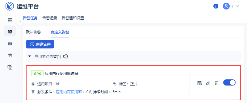 FineOps提供告警管理功能,提供内置的默认告警任务。用户也可自定义异常触发条件和达成告警的持续时间。