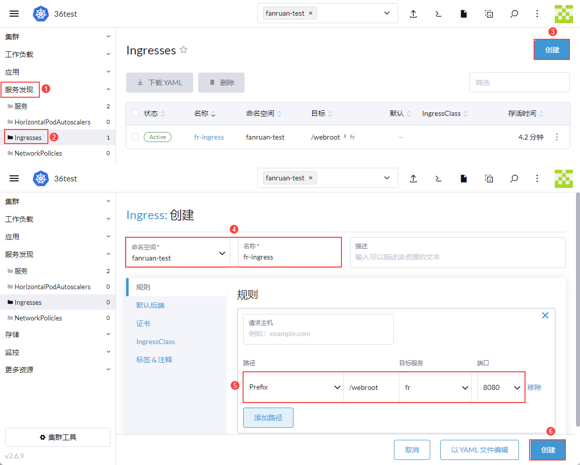 选择指定命名空间,自定义名称,设置路径,选择目标服务。