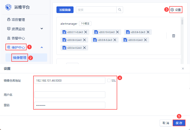 1)管理员登录运维平台,点击「维护中心>镜像管理>配置」,即可查看运维平台的镜像仓库地址。