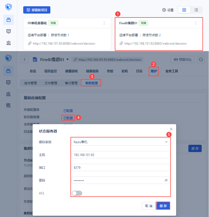方案一 ★★★★★ | 部署全新集群项目,用户无需自行准备单机Redis,只需准备好服务器即可 运维平台部署多应用集群项目时,在「状态服务」中,可勾选「部署Redis单机」 运维平台即会自动帮助用户部署一个单机Redis,并与帆软项目对接好 |
