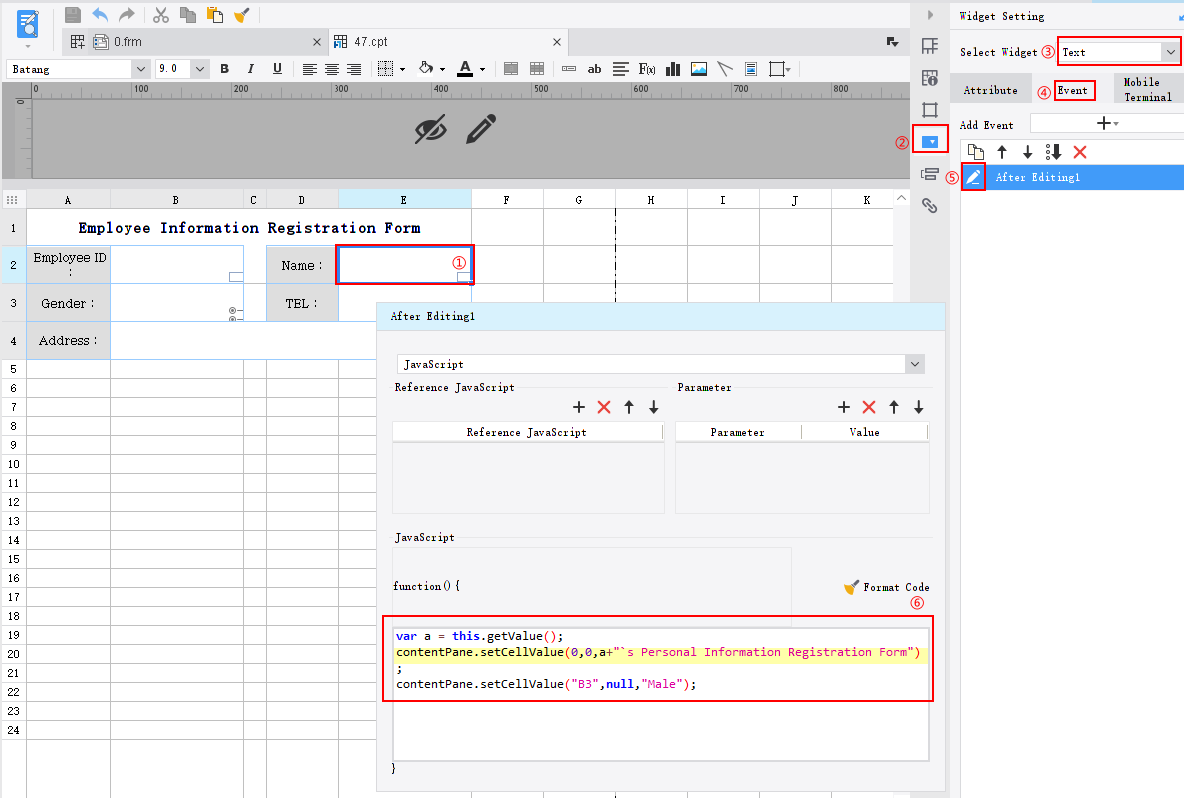 contentPane.setCellValue("B3", null, "Male");When a certain widget has been edited, you can dynamically assign values to other cells or widgets. You are allowed to assign fixed values or assign current widget values to previous values. The textbox widget used in this sample can also be replaced with widgets of other types.