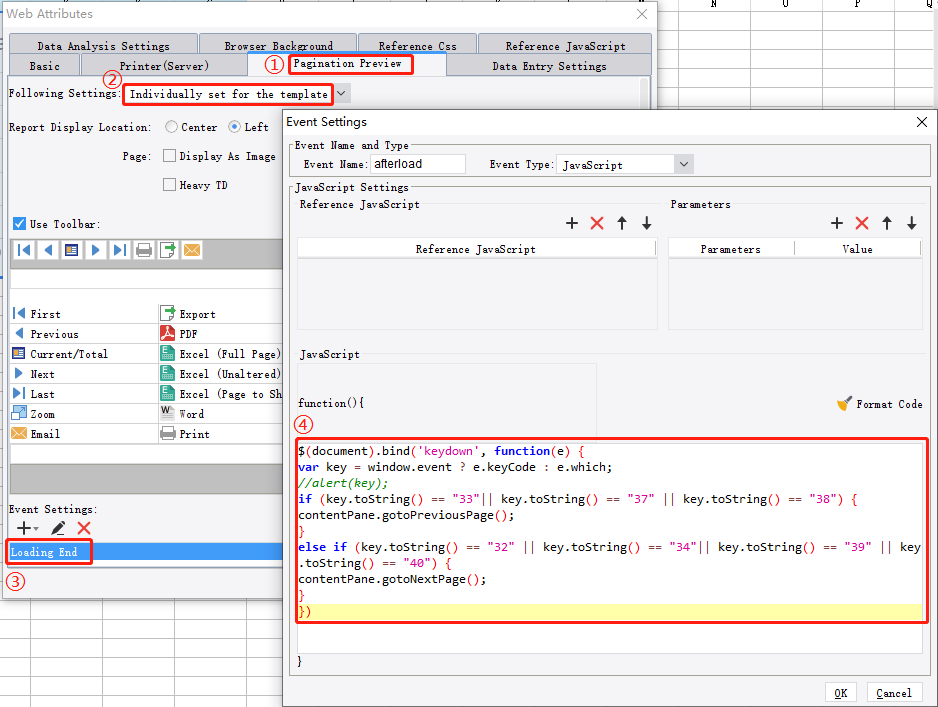 Each key in the keyboard has a unique key code. With JavaScript, we can obtain the key code of the pressed key, judge whether it is a up/down key, and then make the report jump to the previous/next page.