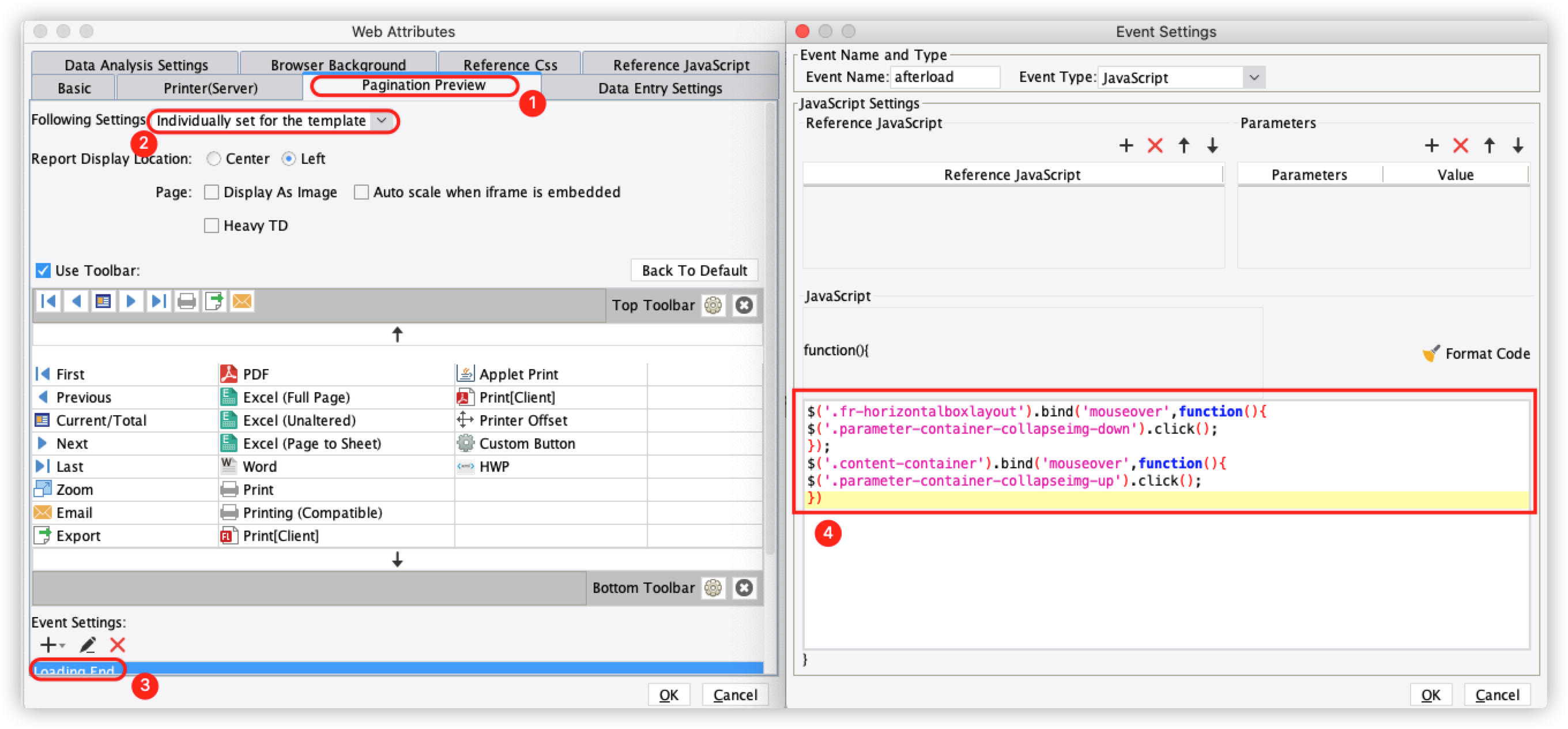 To hide the parameter pane by clicking the main content instead of hovering the mouse over the main content, click [Template]>[Web Attributes]>[Pagination Preview], choose Individually set for the template and add a Loading End event, as shown in the figure below: