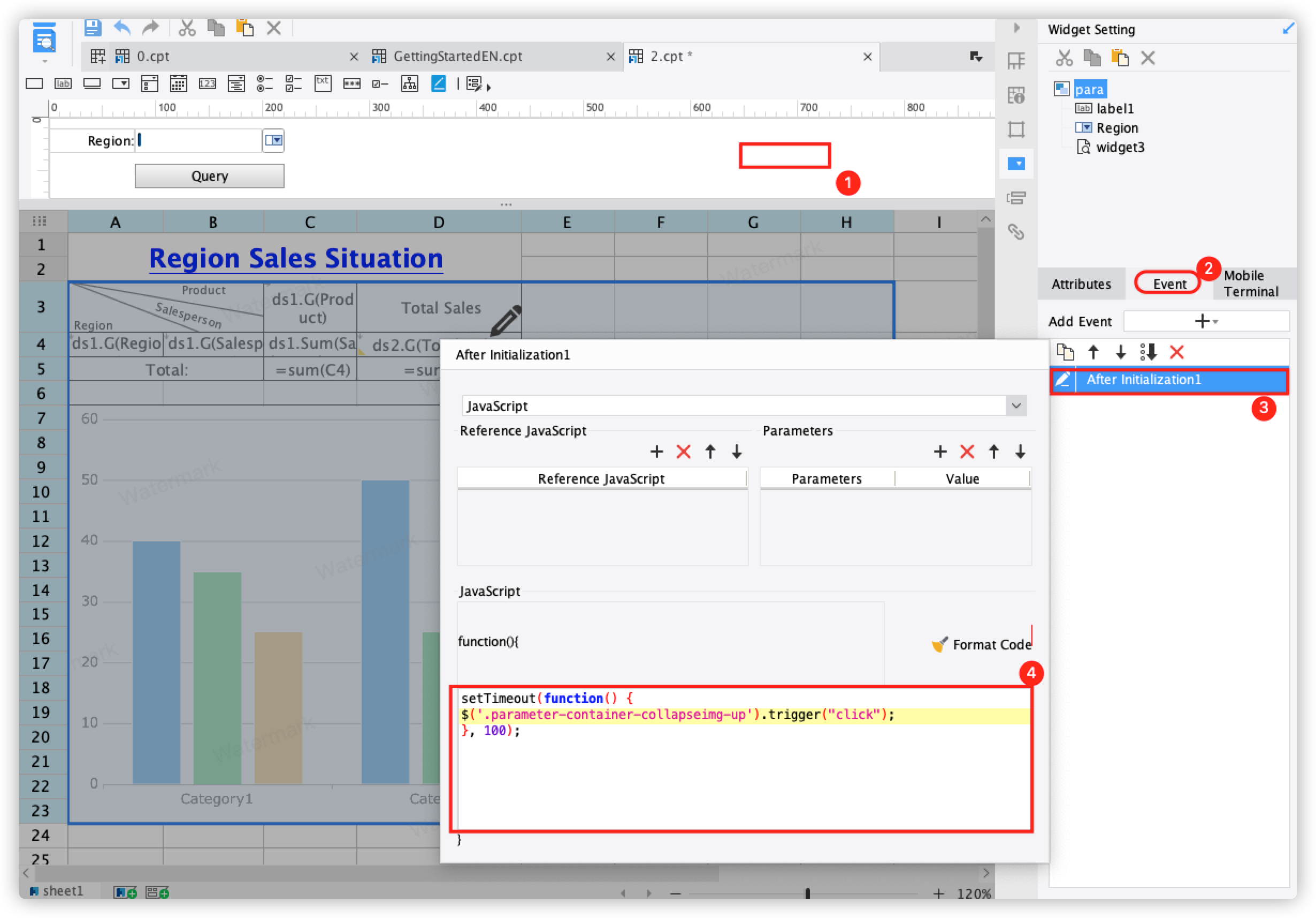 Select the parameter pane, choose the para widget in Widget Setting on the right and add an After Initialization event, as shown in the figure below: