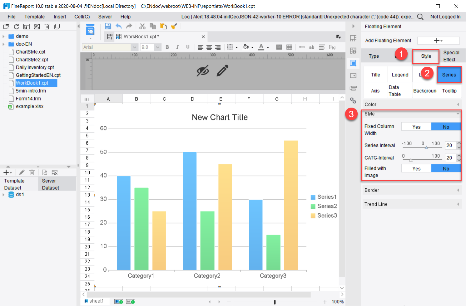 2) The special styles of an ordinary column chart include [Style] > [Series] > [Fixed Column Width], which is set to [No] by default, indicating that the column width is automatically adjusted by the system. Click on [Yes] to customize the column width. You can preview the effect in real time on the left.