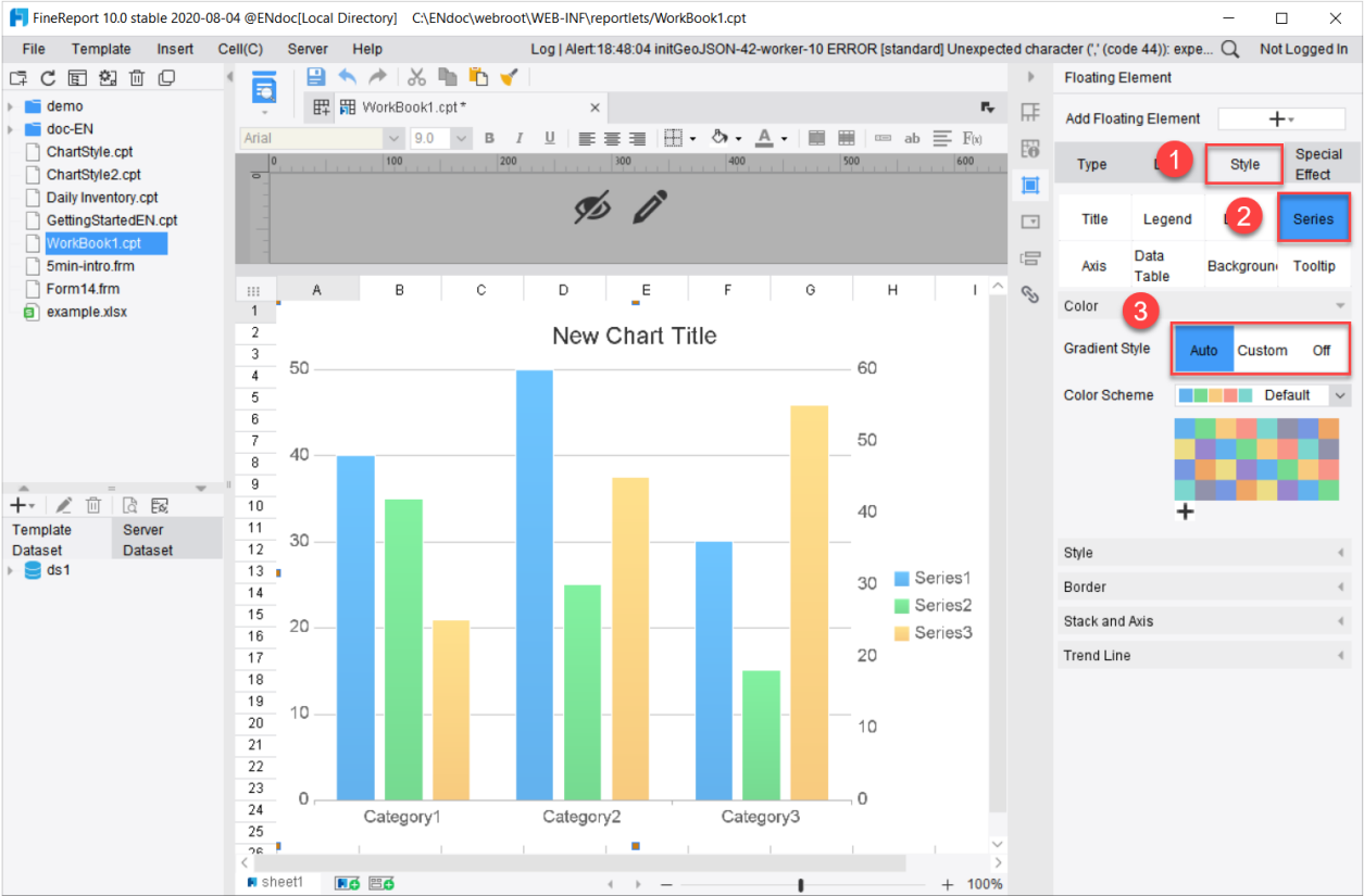 2) Set [Data Source] to [Dataset Data] and select the newly created [ds1] for [Dataset], [Category_name] for [Category] and [Enable Field Name] for [Series Name from].