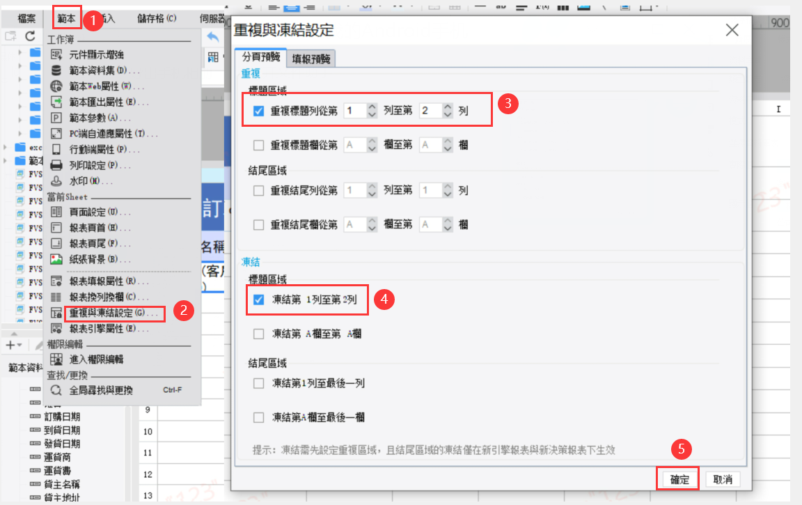3)設定前兩列重複與凍結,操作步驟如下圖所示: