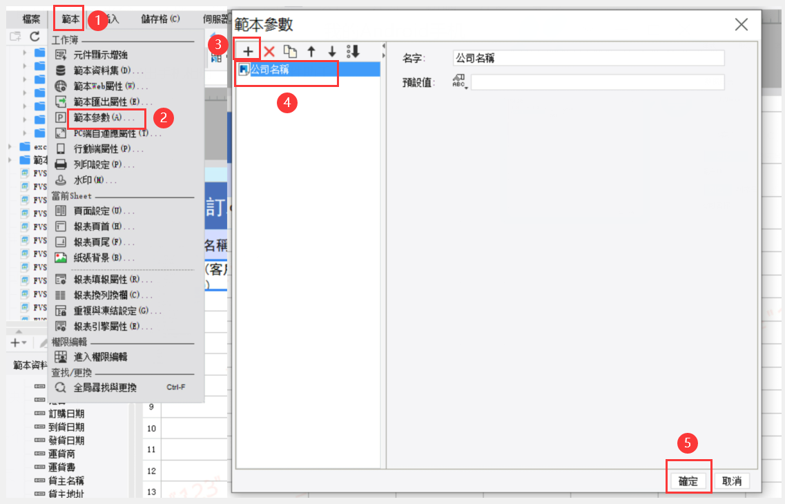 點選「範本>範本參數」,新增文字類型參數,重新命名為「公司名稱」,步驟如下圖所示: