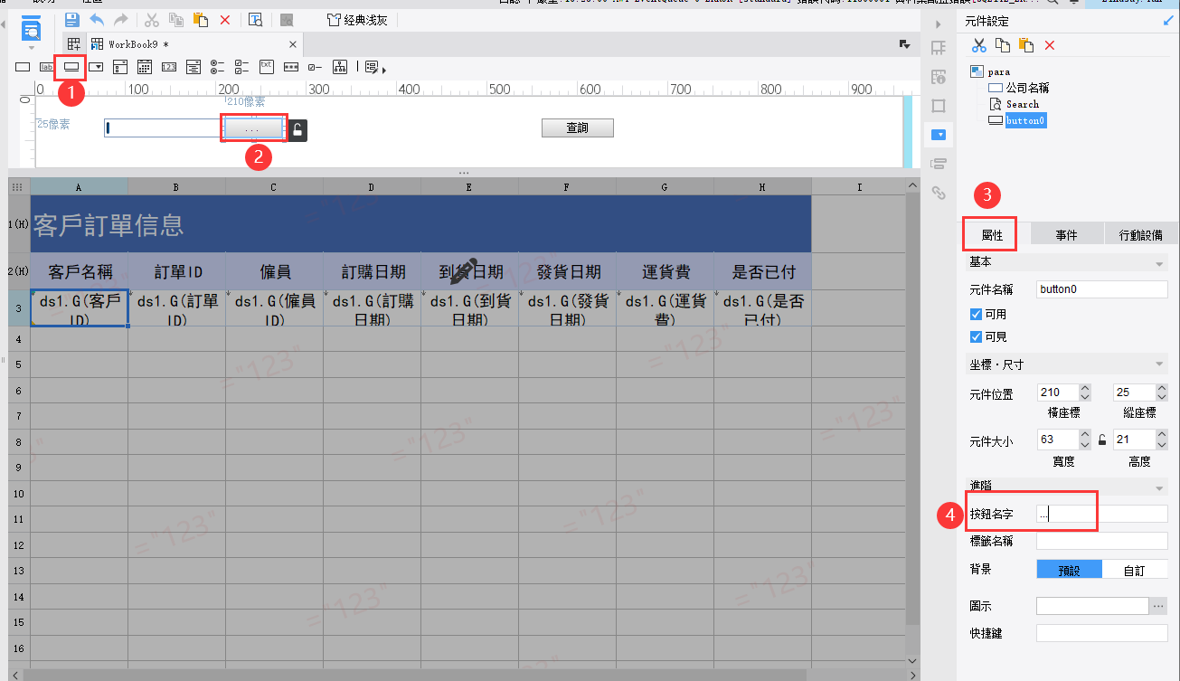 2)拖動「按鈕元件」到參數面板,設定按鈕名稱為「...」,操作步驟如下圖所示:
