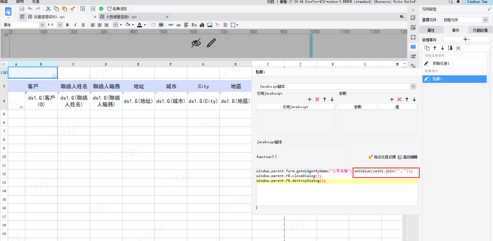 2)修改「子模版」 A1 儲存格「點選」事件的 JS 程式碼,將 setValue(ceshi) 修改為 setValue(ceshi.join("','")) 。如下圖所示:
