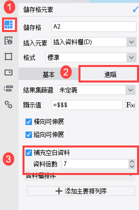 1)選中 A2 儲存格,右邊屬性面板點選「儲存格元素>進階」,勾選「補充空白資料」,設定資料倍數為 7,如下圖所示:
