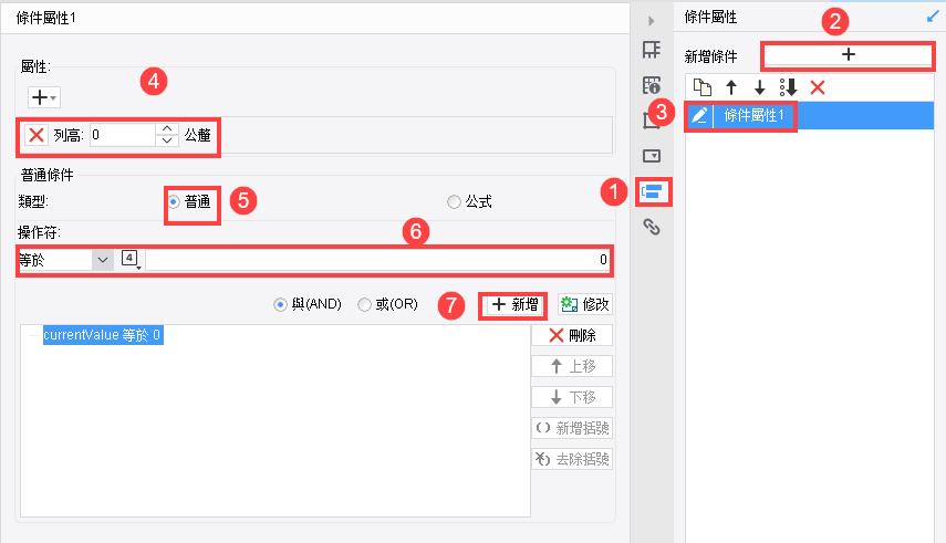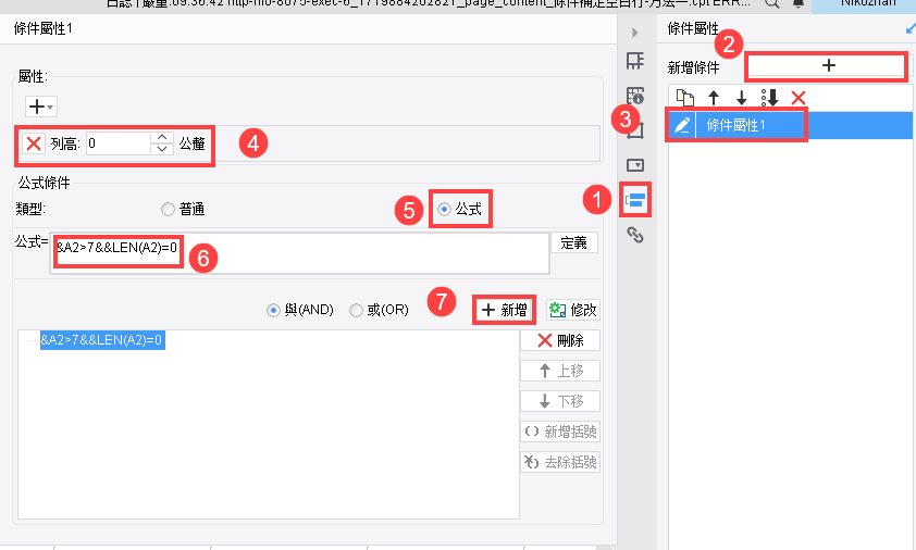2)選中 A2 儲存格,右邊屬性面板點選「條件屬性」,新增一個「行高」條件屬性,設定公式條件為&A2>7&&LEN(A2)=0時,行高為 0,如下圖所示: